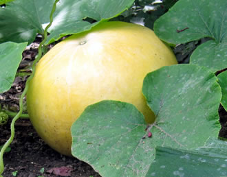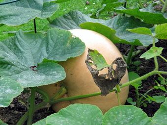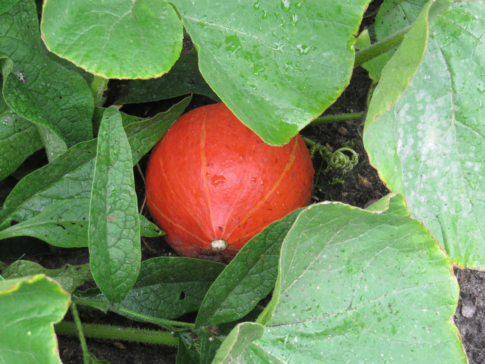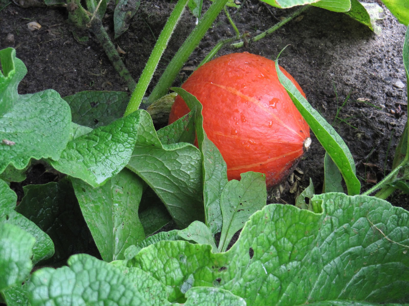Kürbis ran. He liggt komodig mank Kürbisranken un Kürbisbläder