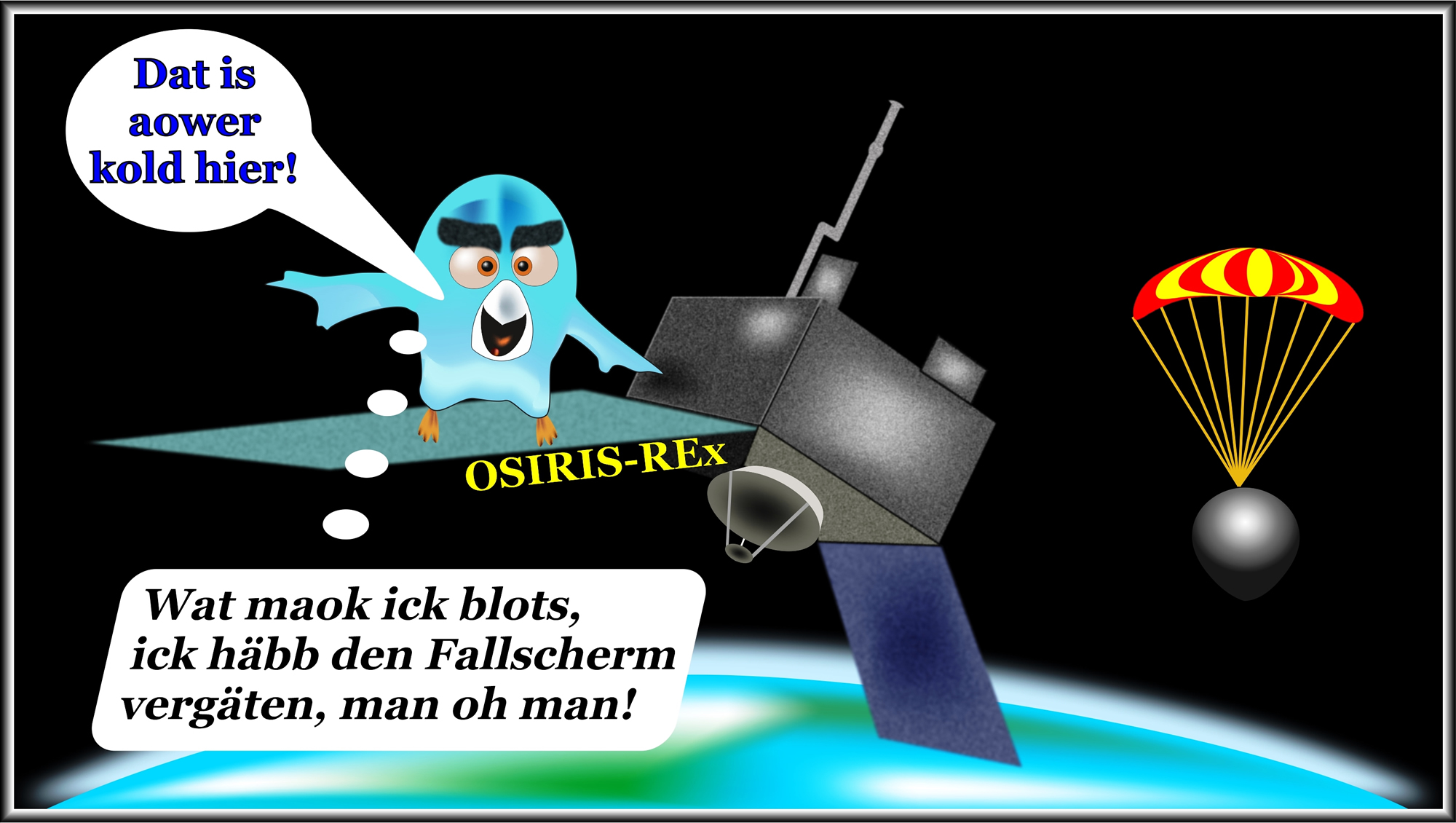 Dit Mosaikbild van den Asteroid Bennu bestaiht ut 12 PolyCam-Biller, dei dei OSIRIS-REx-Sonde an'n 2. Dezember 2018 mit einen Affstand van 24 km upnöhm. Mehr hier: NASA-Video. Dit Bild van dei OSIRIS-REx-Proben-Trüggbring-Kapsel knipsde in'n März 2017 dei StowCam-Imager van dei Ruumsonde.
