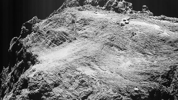 In dei Massenspektren baoven werd dei Stücktaohl van dei up den Detektor ankaomen ioniseierten Deilkes as eine Funktion van dei Laoge up den Detektor wieset, as ein Masse/Laodung-Verhollen (m/z). Man funnt Glycin (C2H5NO2) mit 75 Dalton (afkortet Da), Methylamin (CH5N) mit 31 Da un Ethylamin (C2H7N) mit 45 Da. Dei Köppel van dat Molekül-Ion CH4N+ is dei gröttste, un et entstaiht bi dei Stöt-Ionisation van Glycin mit dei Masse 30 Dalton (Da). Et kann aower uck ut dei beiden annern Amine affstammen. Aale Molekül-Ionen werd dör dei Naober-Massenpeaks van dei tauhören Stamm-Moleküle affscheert. As Bispill finnt wi C3H7O2+ mit dei Masse 75 Dalton pro Elektronenlaodung (Da/e). Dat is woll ein Restmolekül van Propylenglycol (C3H8O2), off van ein Isomer, off sogar van schwörere Moleküle, so as van Butandiol (C4H10O2). Mehr äöwer dei Daten-Anaolyse för Rosina DFMS finnt man in eine Studie van Le Roy et al. Väle Biller krieget wi opstunns van den 67P-Komet "Tschuri". Van dei heele Rosetta-Mission hätt dei ESA tau'n Johreswessel dei Biller for den allgemeinen Bruuk freigäben (süh ESA-Bildarchiev un süh ESA-Biller, aktuell). Dei Rosetta-Sonde sendet jeden Dag neie Biller. Dat löpp noch bit tau'n September 2016. Denn schall Rosetta sülwes up den Komet 67P landen.