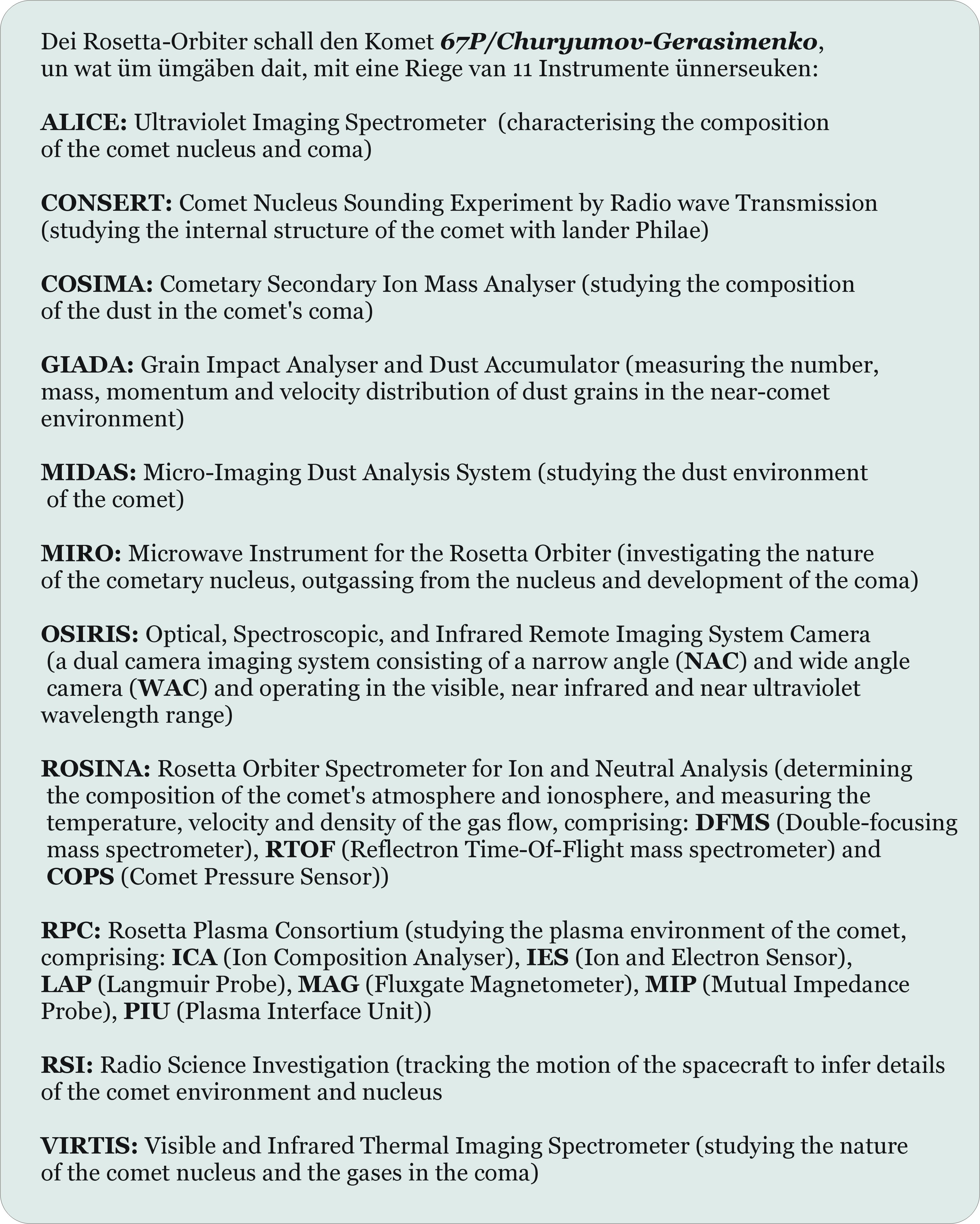 Dortau giff et an Bord van Rosetta ölf Instrumente: