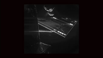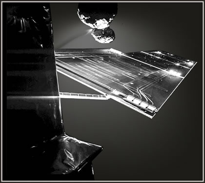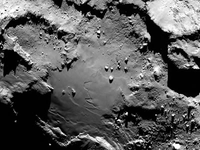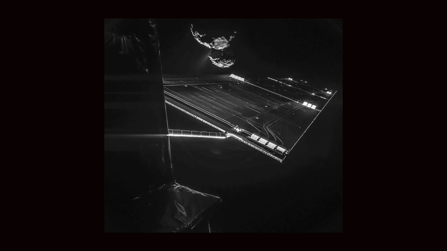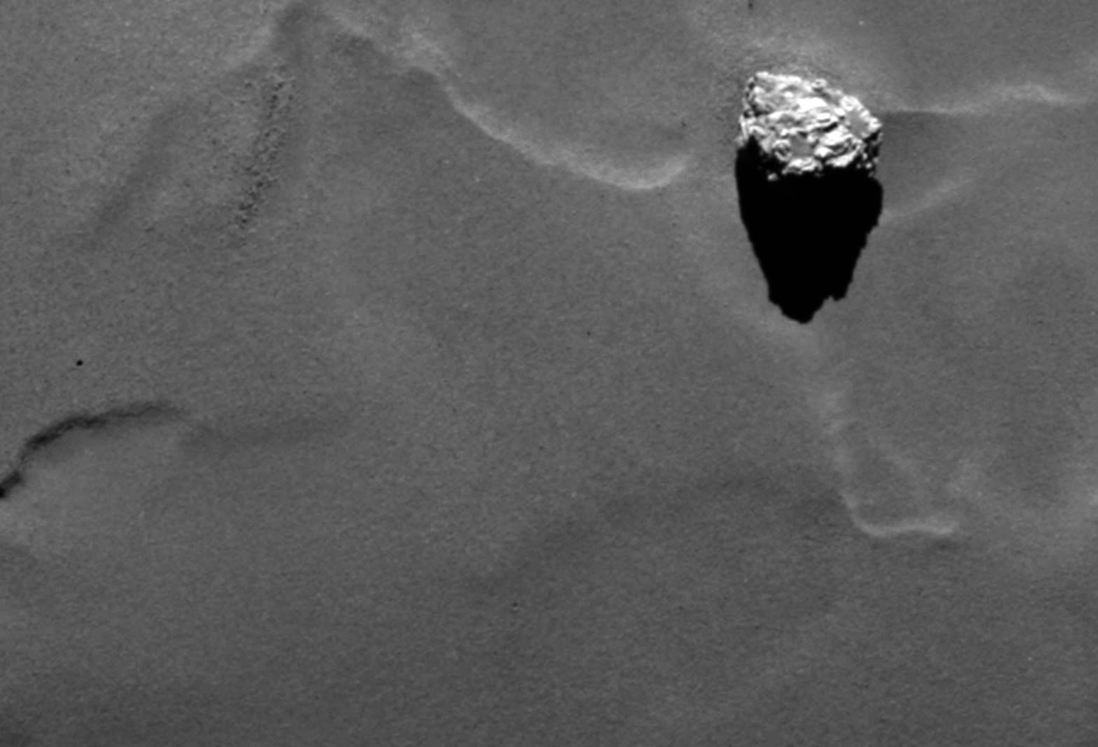 Rosetta knipset sik vör den Komet 16 Kilometer groot is dei Affstand van dei Ruumsonde Rosetta tau den Komet 67P/C-G, as dei Sonde dit "Selfie" mök. Dat was an den 7. Oktober 2014 un et wörd mit dei Kamera van den Landeapparaot Philae up naohmen, dei an Bord van Rosetta mitflügg un dei an'n 12. November up den Kometen landen schall. Up dat Bild süht man einen Deil van dei Ruumsonde Rosetta, ein't van dei 14 Meter langen Solarpaneelen un in'n Achtergrund den Komet. Disse is all aktiv un stött an dei schmalen Stä all Gas un Stoff aff in den Weltruum. För dit Bild wörden twei Upnaohmen, dei man mit verschiedene Upnaohmetieden mök, äöwereinanner leggt, üm den Kontrast tau verbätern, so dat man dei Details bäter seihn kann. CIVA (Comet Infrared and Visible Analyzer) hört tau dei teihn Instrumente an Bord van Philae un bestaiht ut dat bildgäben Panorama-Kamerasystem tau'n Ünnerseuken van dei Landestä un ut Mikroskope för dat Affbilden un dei Spektroskopie van dei mit den Bohrer SD2 upbohrten Materiaolproben ut den Kometenbodden. Ein neiet Bild werd CIVA nao dat Afftrennen van Philae an'n 12. November upnähmen, wenn dei Landeapparaot noch einmaol nao dei Rosetta-Sonde trüggekieken dait. Rosetta maoket Naohupnaohmen van Felsbrocken Dat bildgäben System OSIRIS an Bord van dei ESA-Ruumsonde Rosetta hätt eine bedüden Ansicht van einen van dei välen Felsbrocken, dei up den Bodden van den Komet 67P/Churyumov-Gerasimenko ligget, infungen.