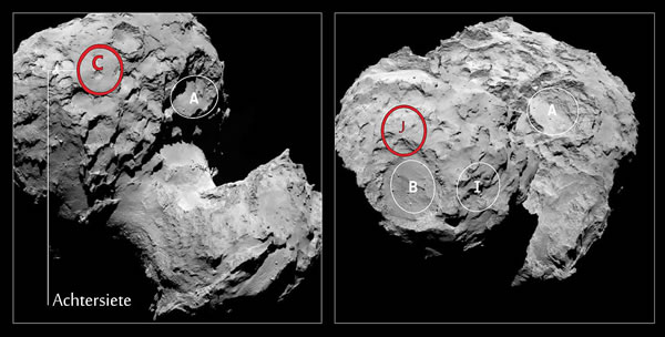uppe ligg. Rosetta werd mit sien naueret Ünnerseuken anfangen, wenn ein Affstand van blots noch 10 km van den Kometenbodden dor is, so käönt dei Kameras noch bäter up disse besünnern Deile kieken. Tautied befaotet sick dei Forschkers besünners mit dei Landestä för dei Dochtersonde Philae, dei an'n 12. November 2014 up den Komet landen schall. Mit dei extrem scharpen Biller schall et möglick wän, dei beste Stä tau'n Upsetten so nau as möglick tau finnen. Dei fasteleggte Landestä J ligg up den Kopp van 67P/C-G. As Reservelandestä wörd C utsöcht.