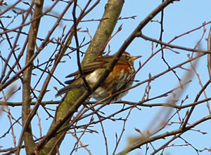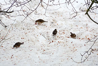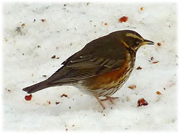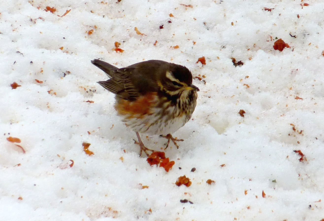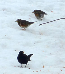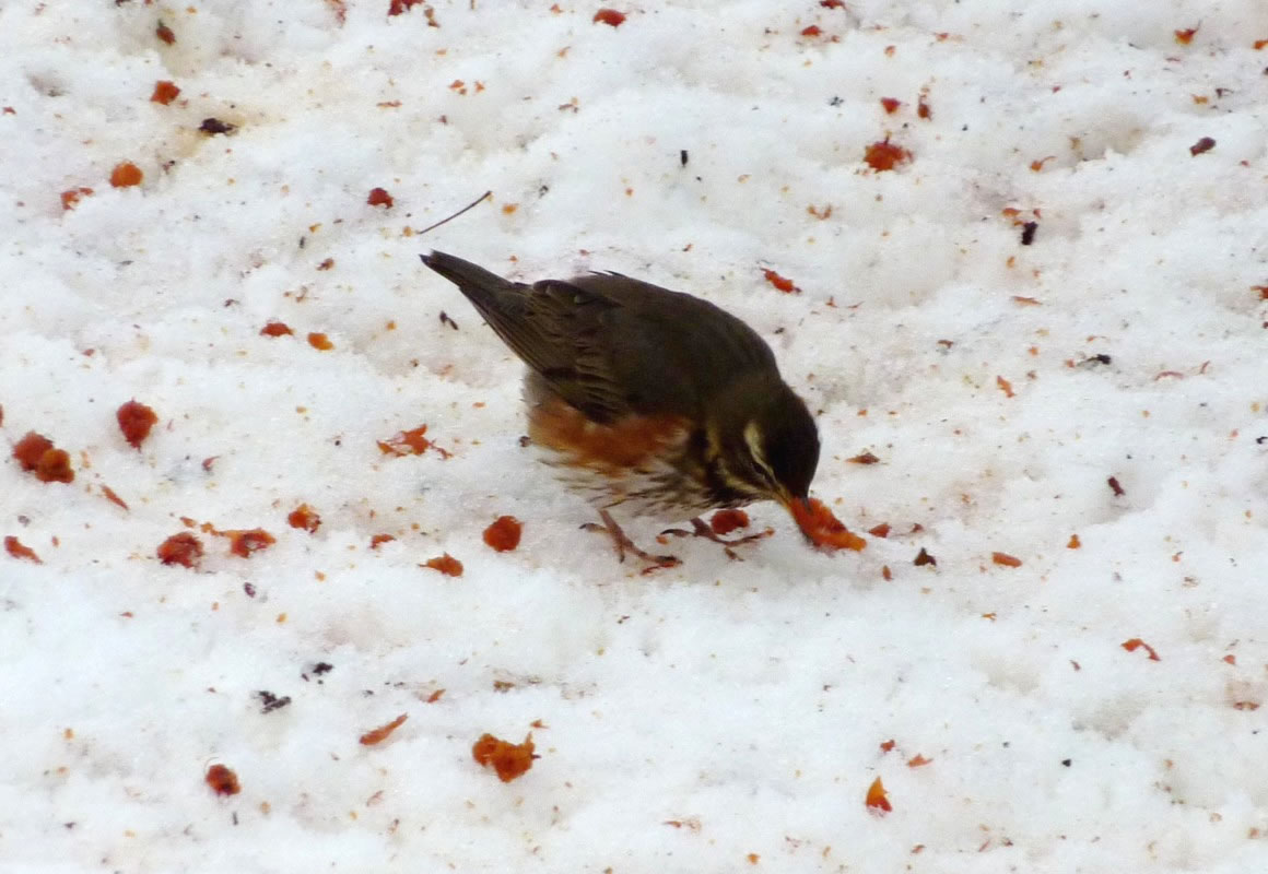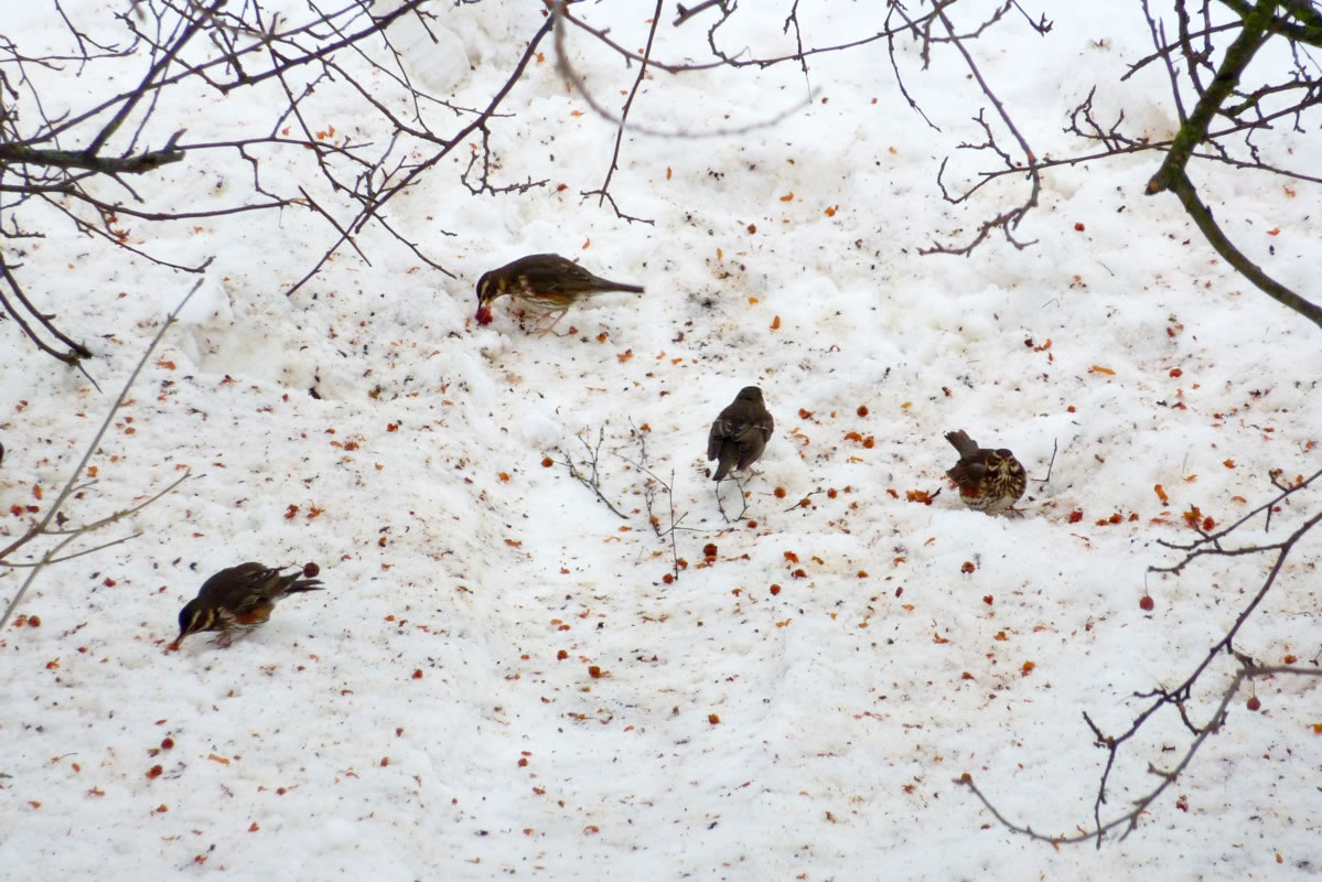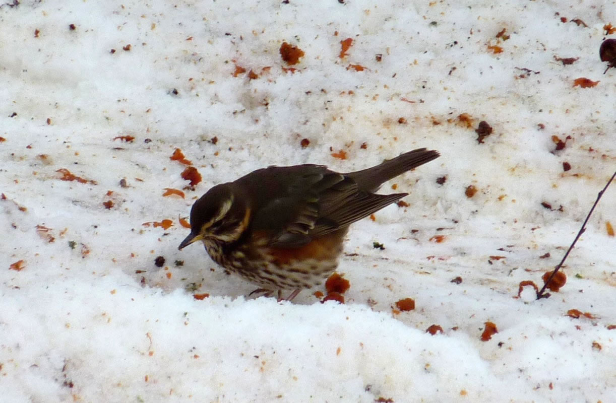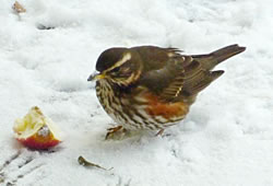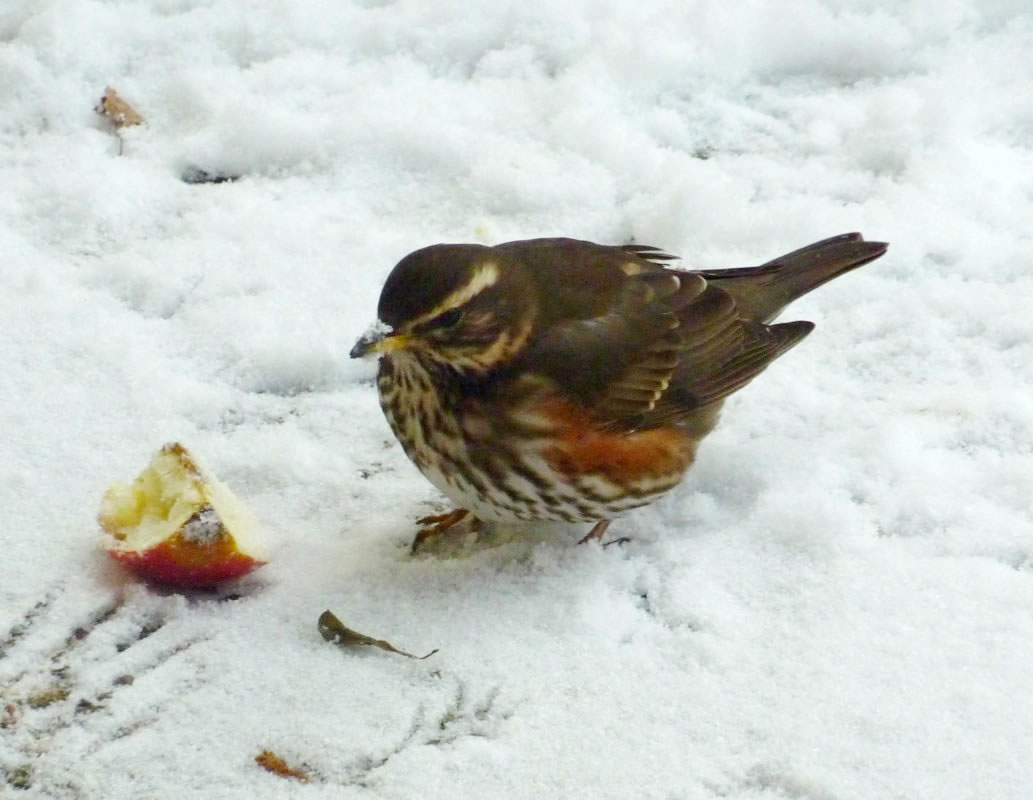 Ganz bescheiden seet he an de Siet un tööv, dat he ok en Stück Appel afkreeg. Aver dat leten de swatten Amseln nich to. Se hebbt den frömden Vagel verjaagt. In de Nacht harr dat wedder düchtig sniet. De frömde Vagel weer al ganz fröh wedder dor. Dat weer en Rootdrossel. Düttmaal seet se in de mit Snee toweihte Heck. Se harr Glück. Dor weer blots een Amsel up de Terrass. De hett de Rootdrossel an en Appelstück ranlaten. De Rootdrossel is hier bi uns nich to Huus. Blots wenn dat enen strengen Winter gifft, kümmt se in uns Gegend. Se is för uns en Wintergast.