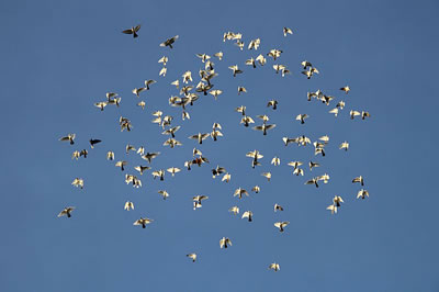 En Heister kann aver den groten Düffer nich vun't Nest jagen. De Heisters sünd aver welk vun de kläuksten Vagels. En Heister tarrt den Düffer orrer de Duuv, de ehren Fiend wegjagt un achter ehm achteranflüggt. Dat wedderhaalt se jümmer wedder, Dag för Dag. Nu köönt de Heisters "sik verafreden", dat se wat tosamen maken mütt. Dat Tarren hürn un seihn ok anner Heisters un weiten so, wat anliggt. De Koppelbildung ward so vörbereidt. Un een mutt noch seggen, dat de klauken Heisters as Schwarm noch kläuker sünd.