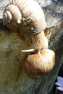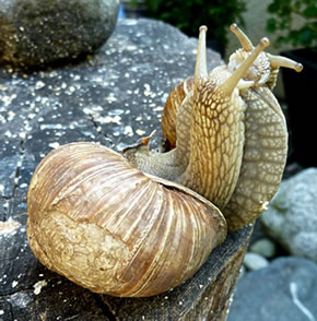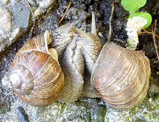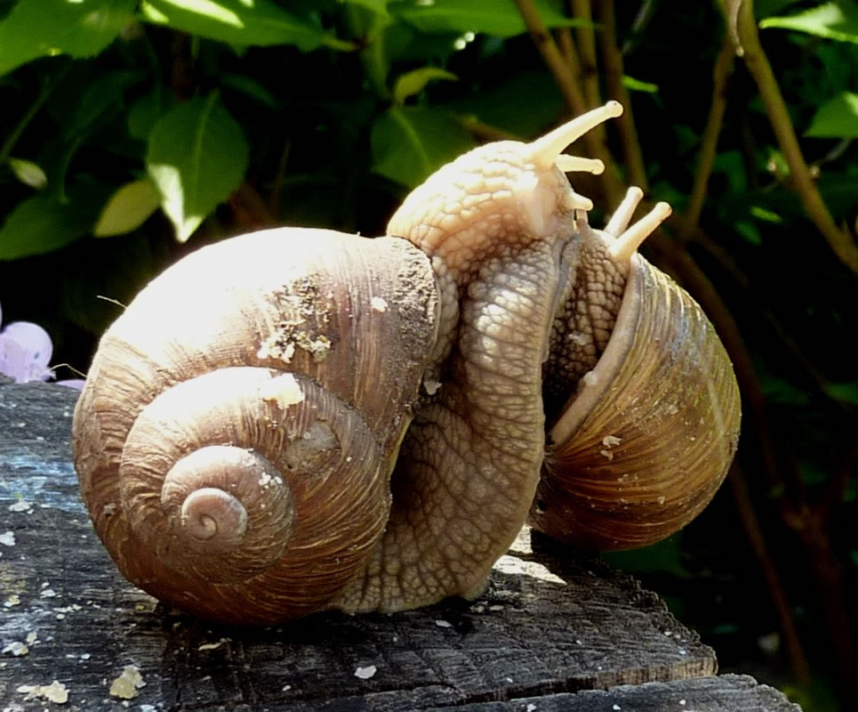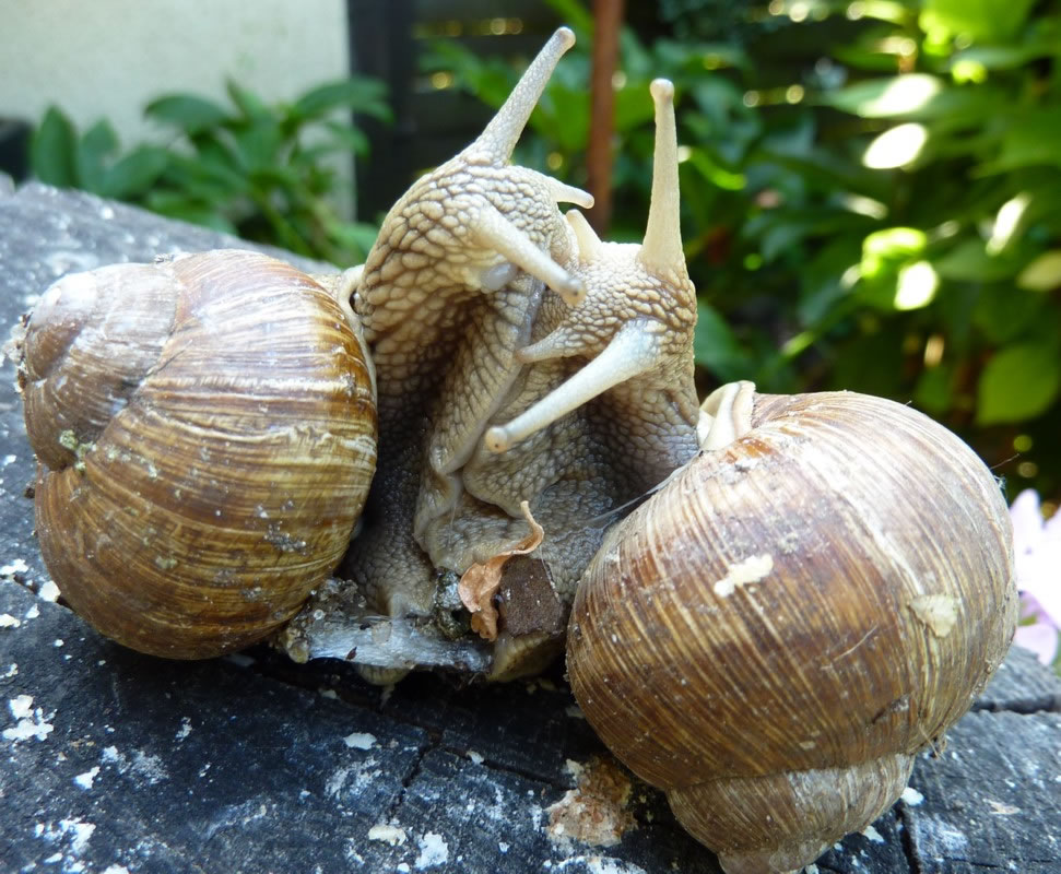 As jedeen Moorn tapp ik toeerst frisch Water för mien Blomen ut den Waterhahn up de Terrass. För hüüt weern wedder 35° C plus anseggt. Up den Weg na den Waterhahn harr ik meist en Snickenpoor breet pett, twee Wienbargsnicken. De legen ganz dicht bieenanner. Dat seeg ut, as weer dor Amor in't Speel, den een vun de beiden harr de Leevpiel (Liebespfeil) drapen. Mit ehr Footsahlen kleevten se aneenanner. Up ehr Hüüs stütt, recken se de Köpp piel in de Höcht. Seeg ut, as wenn se sik in de Ogen keken un sik toswiestern: "Ik mag di lieden!" Mit de Föhler strakeln se sik. De Liever bewegten sik dorbi hin un her. Dat weer wull so 'ne Oort Snickensex. För mi weer dat richtig grote Leevde.