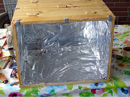 An een Siet (nich gegenöver de apen Siet, sünnern dorblangen!) bohr ik Löcker un deck ehr mit Flegengitter af. De Löcker sünd to'n Entlüften, avers dor schallt keen Insekten rinkrupen. Dorüm nehm mööglichst fienes Flegengitter. Mit'n Kleevpistool un lütte Holtleisten warrt dat Flegengitter över de Löcker fastmaakt.