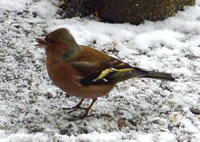 | In de lütt Bost liggt en bannig groot Hart, dat sleiht veel sneller as bi de Minschen. Un de Lief is in Sommer un Winter so 40° C hitt, un so mutt dat ok sien. Dat kost natüürlich veel Foder(Energie), dormit de Vagel jümmer so warm blifft. Uns Bookfink wiggt jo man eben so veel as'n Breef bi de Post. Wat meenst, wat de Wind dörch den lütten Keerl dörchhuult! Un fleegen mutt he ok noch jümmer. Dorüm hett he allerhand Luftbüdel in sien Lief, de em bi'n Flegen beten helpen. Sogoor de Knaken sünd mit Luft füllt un nich mit Mark, as bi uns Minschen. He hett ok keen Teen, he hett 'n lichten Snavel ut Hoorn un keen Nees, bloots Neeslöcker. Dat meiste Gewicht an den ganzen Vagelkopp hebben de Ogen. Jo, wi weeten dat jo all: De Vagels köönt hellsch goot kieken. Nix gifft dat, wat se nich sehn. De passen op, as'n Adler. | ![]() |