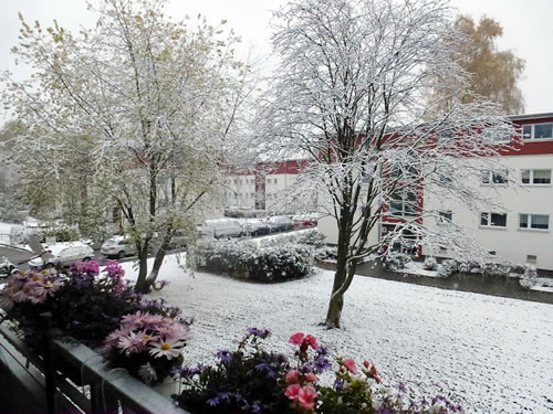 Dezember op mien Balkon Muschkatt! As ik an' Nikolausmorrn op mien Balkon rutkeem un nieges Foder henkrümeln wull, fleeg wat lüchten Rodes na den Vagelbeerboom röver. Schwupp! Weg weern se! Dat weern doch woll Dompfaffen, Gimpel un Sünnbloomkerns harrn se freten! Miene Sünnbloomkeerns, de ik henkrümelt harr. Wat ik mi doch freuen dä!