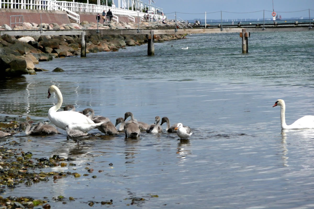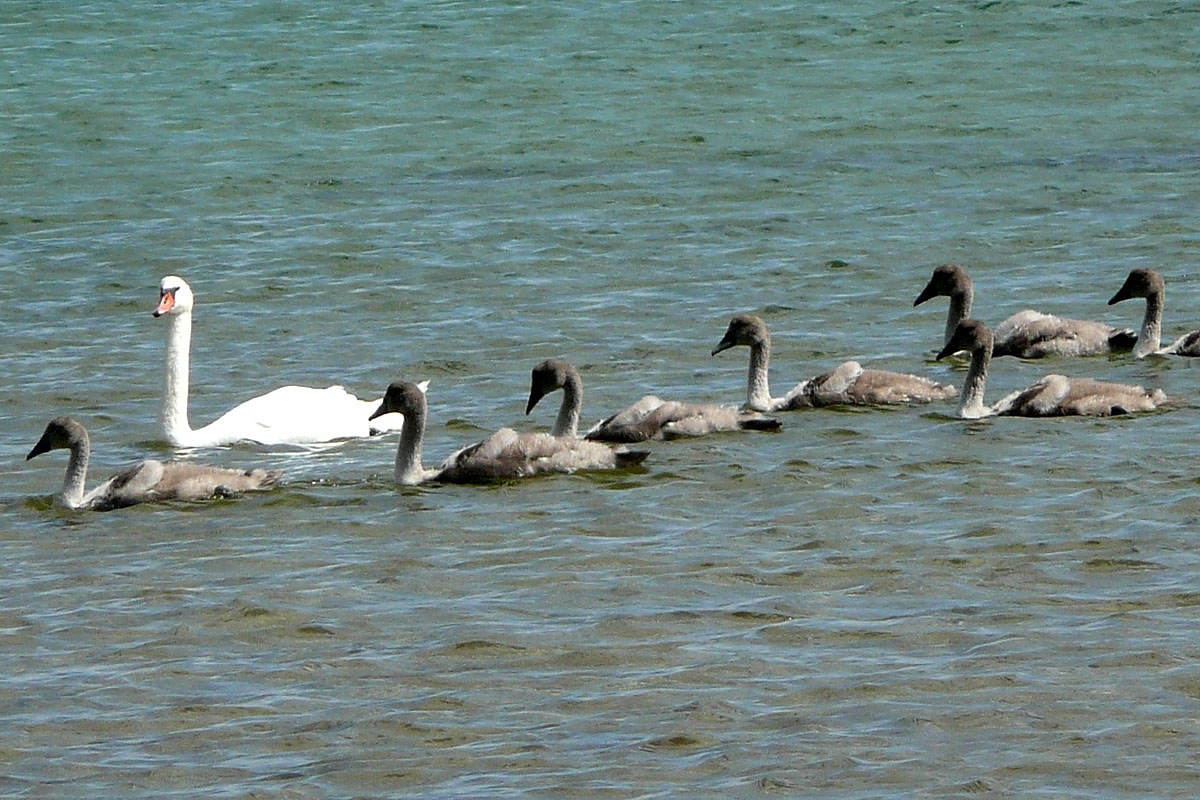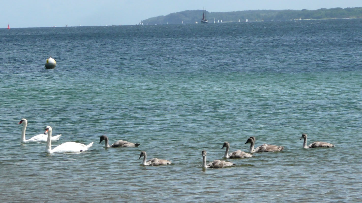 Över een Week sünd se nu al up de Trav. Se sünd in de Twischentiet al ornlich wat gröter woorn. Mi will dat ümmer noch nich in'n Kopp, wosück de Swaanfamilie dat schafft hett, bit in de Trav to kamen. Aver de lütten Aanten loopt ja ok oftins en groot Stück över Land achter de Modder her, bit se dat grote Water funnen hebbt. Nu bün ik neescherig, up Swaana un Swaanrich in't tokamen Johr wedder na den Karpendiek kaamt un dor ehr Eier utbröödt. Ümmer noch draap ik de Swaans mit ehr söven Kinner. Mitünner sünd se up de Trav an'n Jachthaven un mitünner ok an den Strand. Se sünd al düchtig ranwussen. In Kiellinie swimmt se, den Kopp up den slanken Swaanhals in de Hööcht reckt, altohoop över de blage Oostsee. Dat is smuck antokieken. De stolte Vadder vörut un Modder achterna.