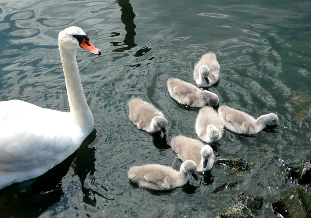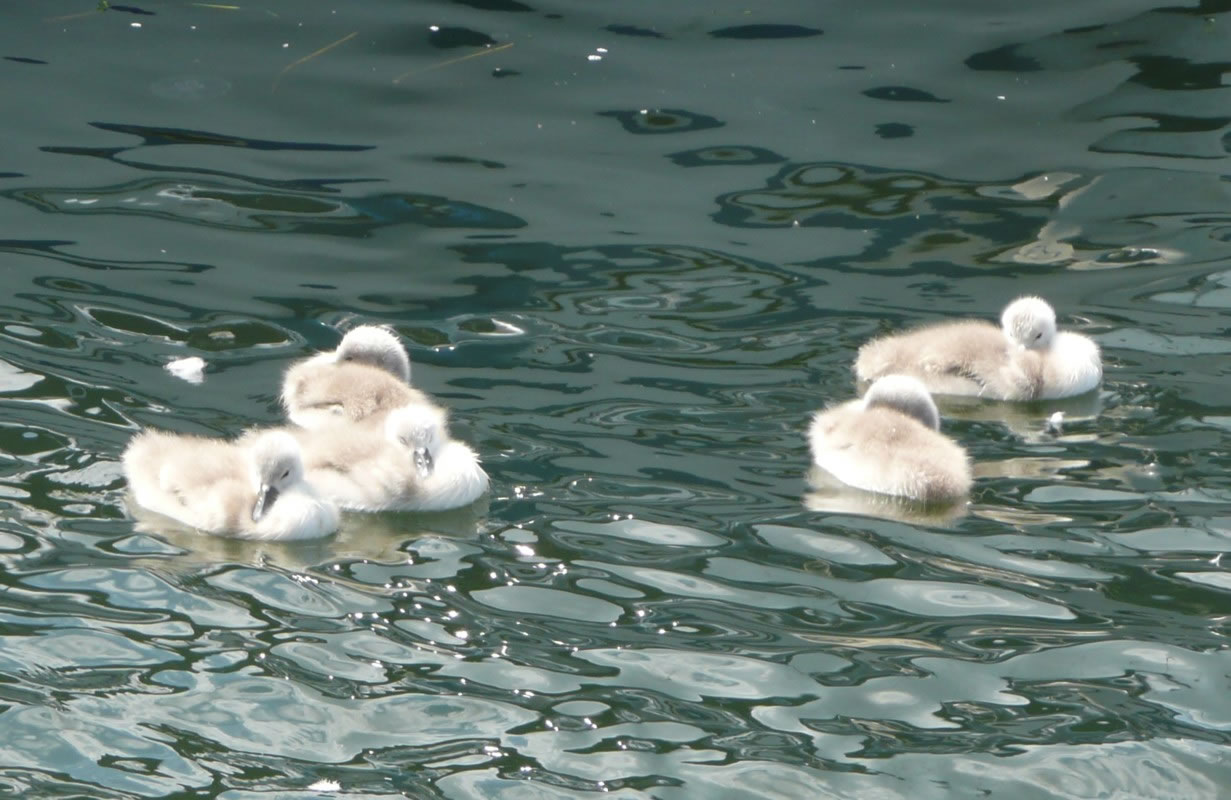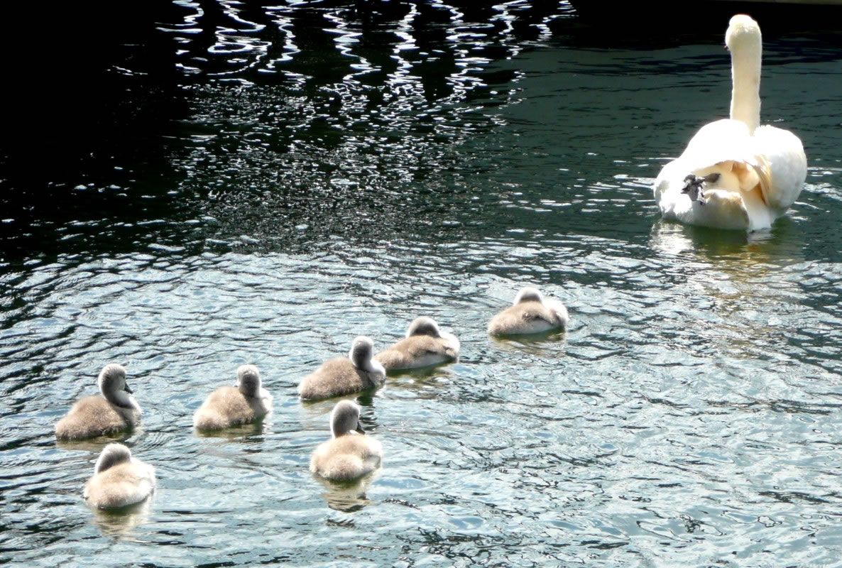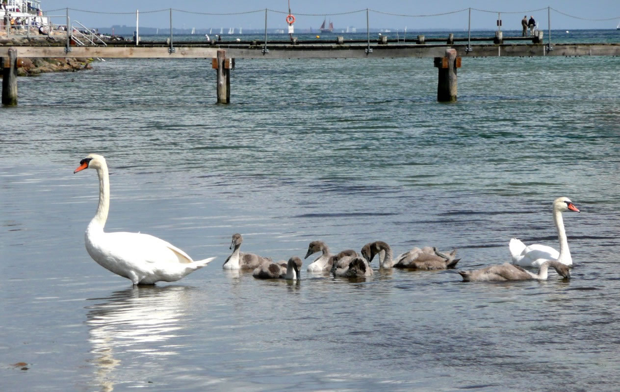 Över een Week sünd se nu al up de Trav. Se sünd in de Twischentiet al ornlich wat gröter woorn. Mi will dat ümmer noch nich in'n Kopp, wosück de Swaanfamilie dat schafft hett, bit in de Trav to kamen. Aver de lütten Aanten loopt ja ok oftins en groot Stück över Land achter de Modder her, bit se dat grote Water funnen hebbt. Nu bün ik neescherig, up Swaana un Swaanrich in't tokamen Johr wedder na den Karpendiek kaamt un dor ehr Eier utbröödt. Ümmer noch draap ik de Swaans mit ehr söven Kinner. Mitünner sünd se up de Trav an'n Jachthaven un mitünner ok an den Strand. Se sünd al düchtig ranwussen. In Kiellinie swimmt se, den Kopp up den slanken Swaanhals in de Hööcht reckt, altohoop över de blage Oostsee. Dat is smuck antokieken. De stolte Vadder vörut un Modder achterna.