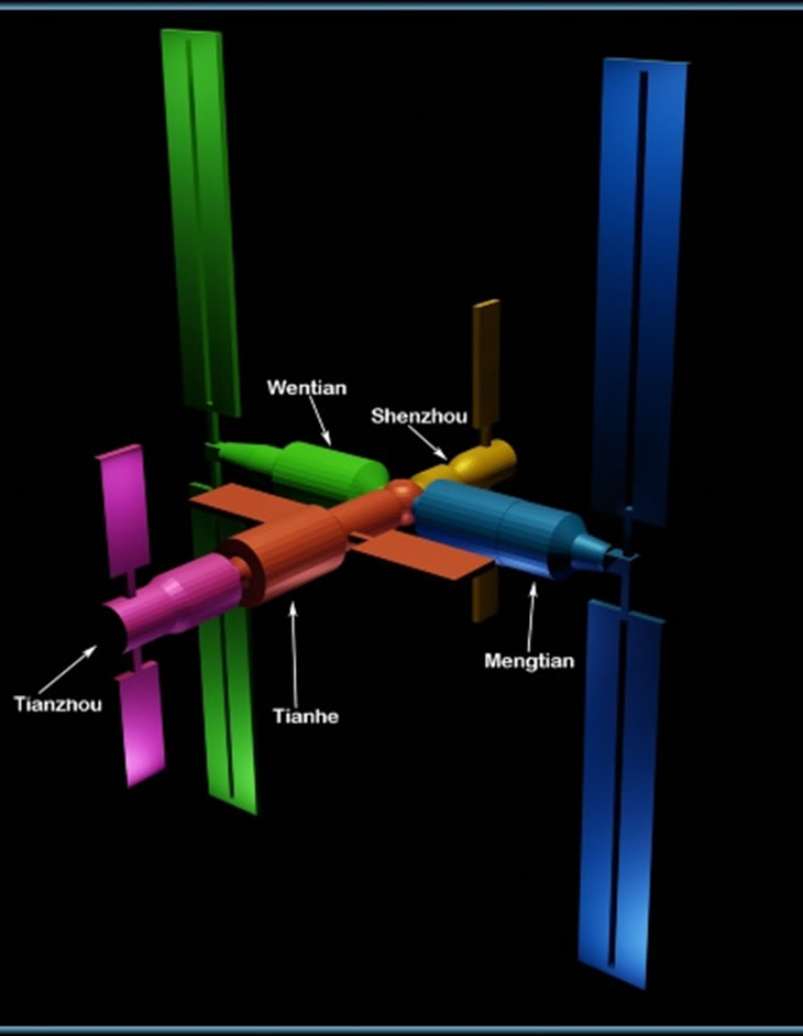 Dat Kernmodul "Tianhe" is an'n 29. April 2021 van den chineeschen Ruumfaohrt-Baohnhoff Wenchang ut in't All flaogen. China mellt, dat dat Ruum-Fohrtüg nu in den Erd-Ümloop in 380 km Hööchte is. Dat is ein relativ siede Hööcht. Dei ISS flügg bloots wat minne höger in 420 km Hööchte. China is mit den Bau van siene eigen Weltruum-Station in'n Gang kaomen. Eine Rakete van den Typ "Lange Loop 5B" steeg an'n 29. April 2021 mit dat Karn-Modul van dei Weltruum-Station van den Ruumfohrt-Baohnhoff Wenchang up. Dat 22 Tonnen schwore Modul "Tianhe" ("Himmlischke Harmonie") is dat Hauptdeil van dei Ruum-Station, dei 2022 fardig wern schall. Nao teihn Minuten sprüng dat Modul van dei Rakete aff. Wat läöter güng Tianhe in den vörseihn Erd-Ümloop. Tianhe is 16,6 m lang un hätt einen Dörmäter van 4,2 Meter. Et is dat gröttste Ruumschipp, dat China bit nu hen bawde. Drei annere Ruumschippe käönt gliektiedich andocken tweie uck för eine längere Tied. Dat Karn-Modul sorgt för Strom un Andriew un hätt Waohnstäen för drei Astronauten, dei rund sess Maonde an Bord bliewen käönt. Twei ähnlick groote Module för Wätenschkup-Experimente schäöllt noch in T-Form anbawt wern.