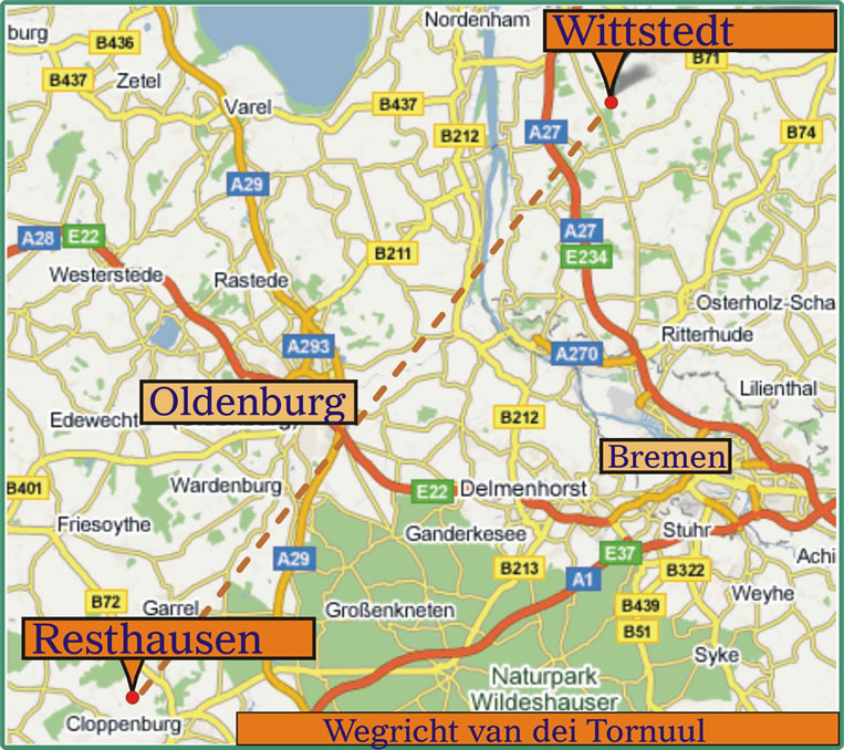 Dei Weg van dei Tornuule wör also düsse dei Koarten käönt Sei dör'n Klick vergröttern. Wo väl Ümweeg sei dortüschken naohmen hett un wat sei doarbi allens belävet hett, dat werd nüms van us jemaols tau wäten kriegen. Ehr Uulenläven is dör ein Auto tauenn gaohn. För dei Tornuulen, dei elkeine Nacht dör use Gägend fleiget, wünscht wi ein langet un gauet Uulenläven. Foto Toornuul: