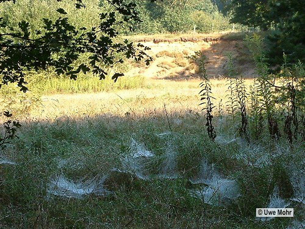 Wie de Harvst sien kann, hebbt wi in de eersten Doog erlevt. Kann nur beter warn, seggt de Metereologen, denn Hoch "Hamich" verjogt de Regenwonlken. So wünscht wi uns de Oltwieversommer. Schön to sehn in't Gras, bi uns in de Sandkuhl. De Noom hett jo nix mit ohle Frunslüüd todoon. Ne, dat sünd de Spinnfoden, de dörch de Luft sweven, un de kunstvullen Spinnennetze, in de Dau wi Perlen blinkern. Hüüt, an föfften, hebbt wi Niemoond un allerbestes Wedder: "Wi in September de Niemoond de Dag vörfind, so ward dat Wedder de ganze Harvst bestimmt."