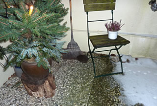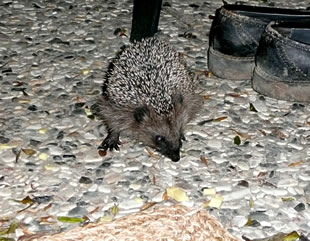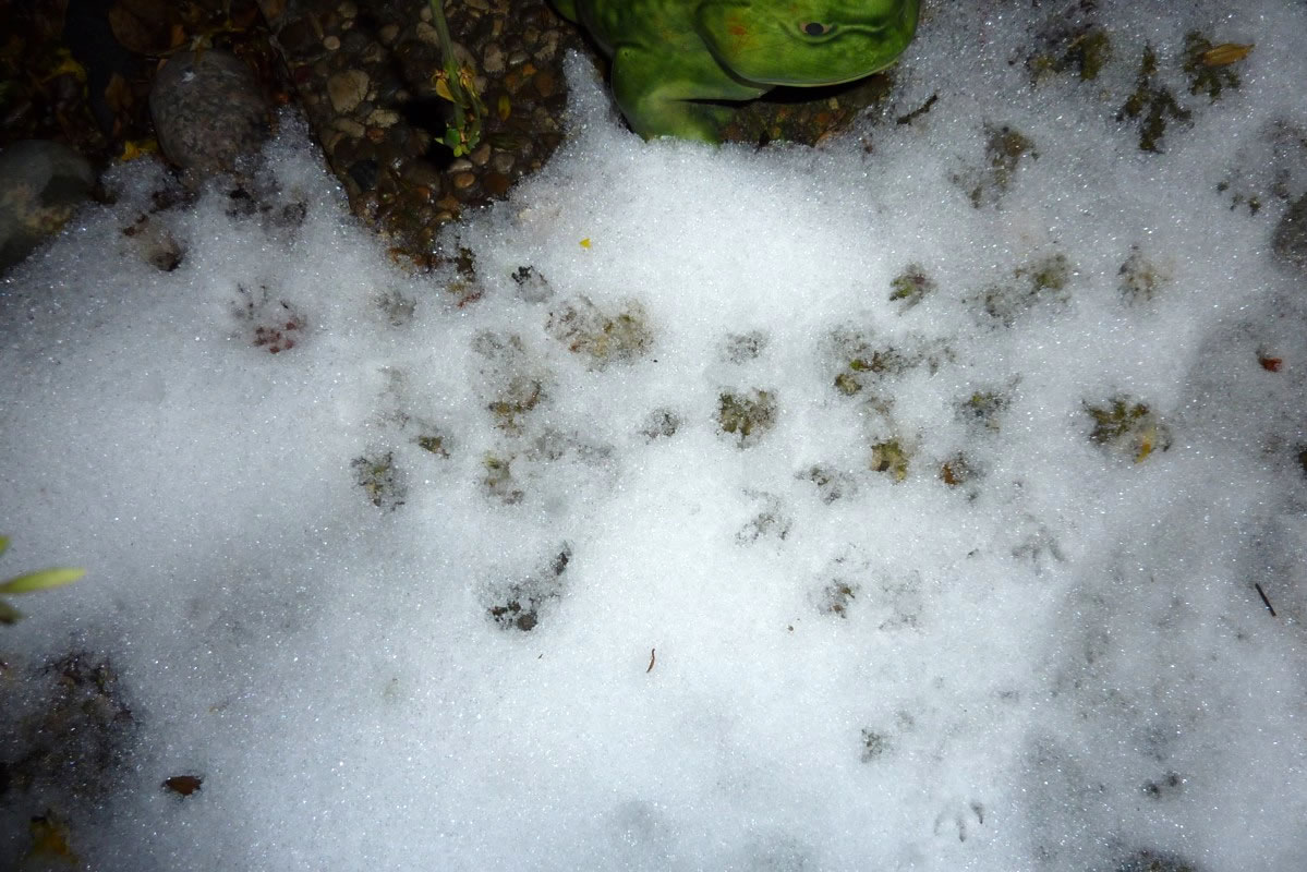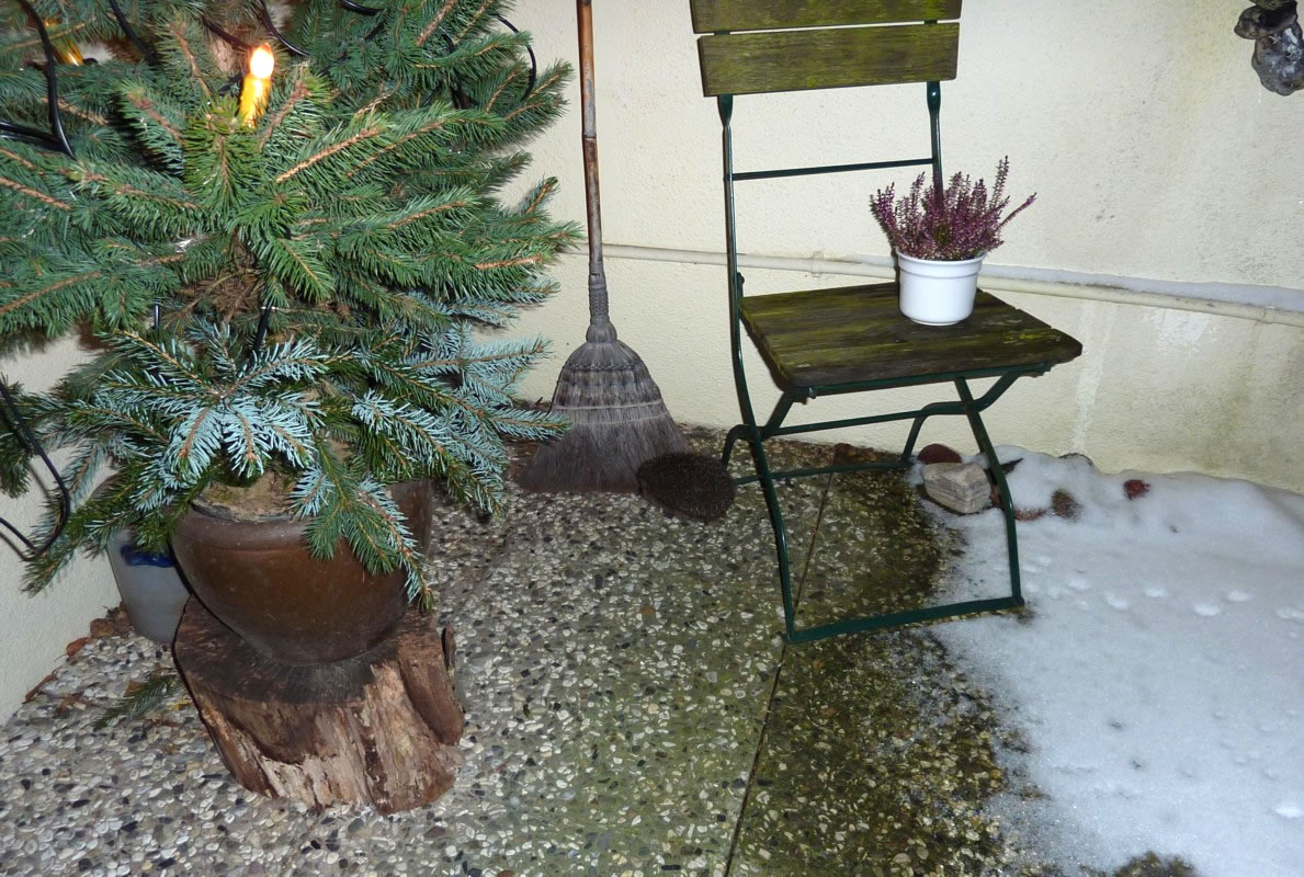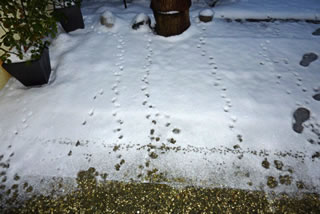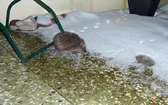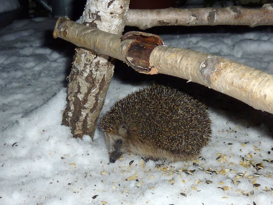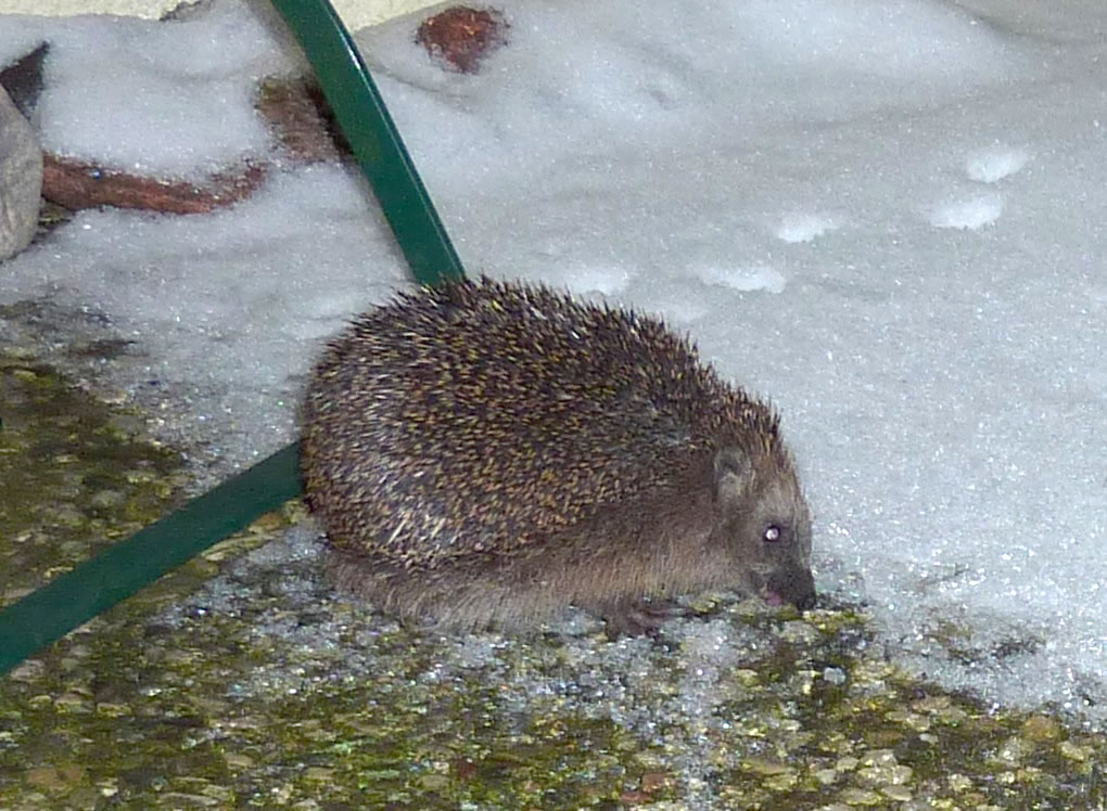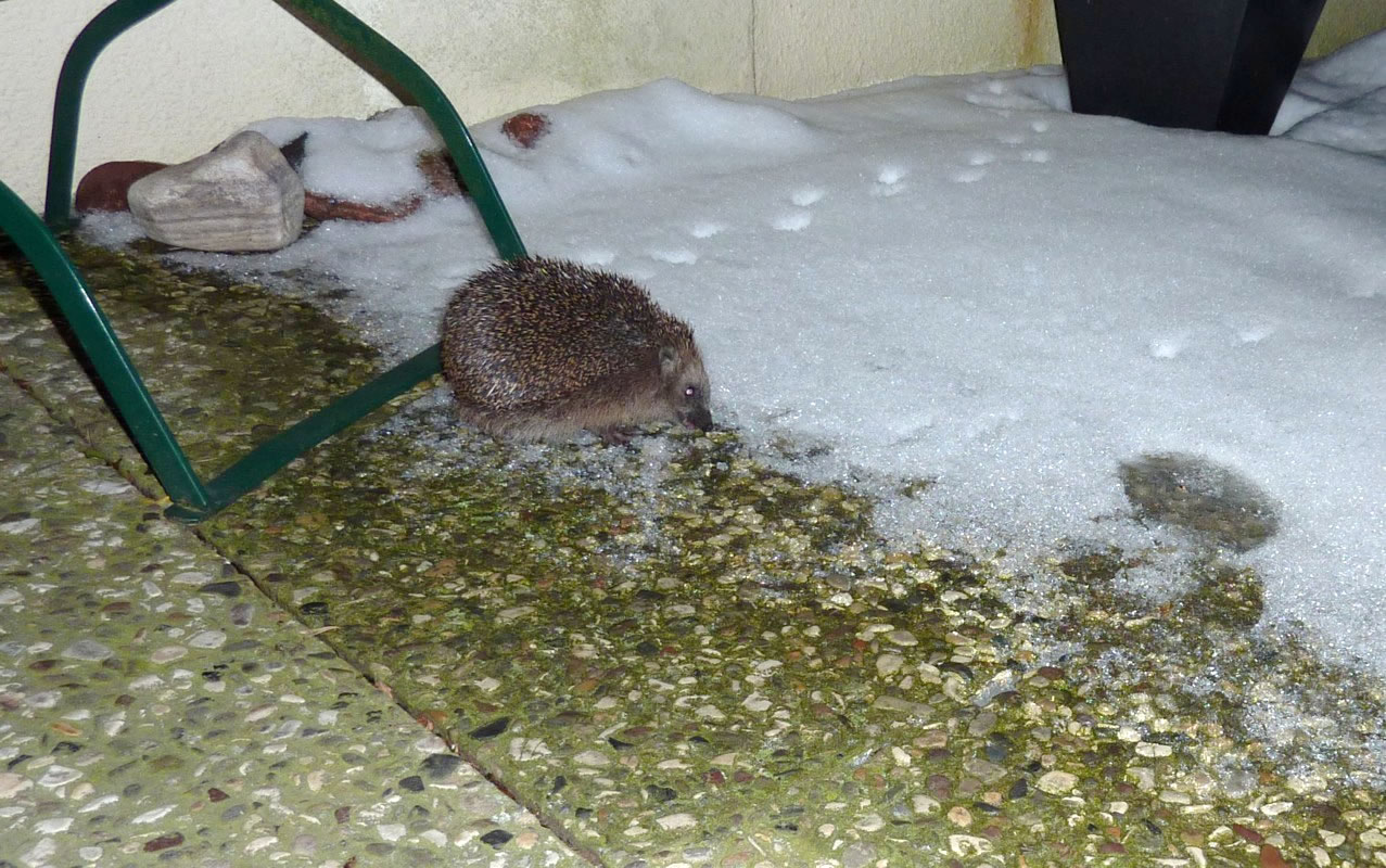 Gau leep ik na ünnen un heff em Foder hindaan. Na'n poor Minuten weer he wedder dor un hett sik den Buuk vullhaut. Sienen Döss hett he mit andauten Snee löscht. Dat Water in de Vageltränke weer to Ies froren un mit Snee todeckt. Dor hett he sünst ümmer den Döss löscht. Noch en poormaal keem he an düssen Avend up de Terrass. Ümmer hett he sien Footsporen trüchlaten. Dat weer för uns en richtig Wiehnachtsgeschink. De lütt Swienigel is vun dor wedder jeden Dag to uns kamen. Wi hebbt uns fraagt, of so'n lütten Swienigel ok Glück in't niege Johr bringt? Vun de lütten Swien seggt man doch, dat se för dat tokamen Johr Glück bringt. Aver of dat för den jungen, lütten Swienigel goot is, dat