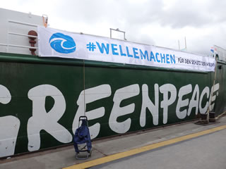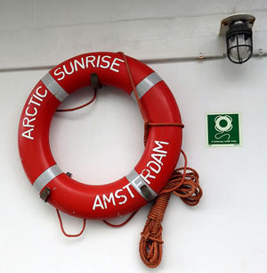 De Arctic Sunrise ward siet 1995 vun de NonProfit-Organisation Greenpeace nütt; de Heimaathaven is, as op'n Rettungsring to sehn, Amsterdam.