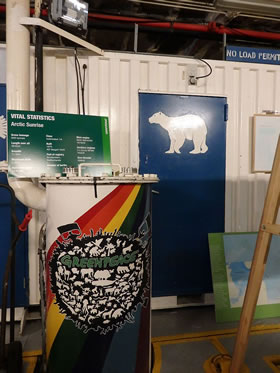 Op'n Weg na de annere Siet sehg ik den hoogen Utsichtsturm, wo een vun de Besatzung hochklattern mutt, üm to'n Bispeel in de Arktis to kieken, wo in dat veele Ies en Weg is, dörchtokamen. Op düsset Foto sünd uk poor vun de velen Gerätschaften to sehn. De "Arctic Sunrise" is ja nich bloots en Iesbreker, üm dat Ies to breken, se is ok to'n Erkunden vun de arktische Ümwelt dor. In dat Föhrerhuus hett uns Kim, en jungen Mann ut Südkorea, de ganzen Apperaaten wiest un verklaart. De Böker un annere Saken in den Ruum sünd all fastmakt, denn wenn dat Schipp op See is, fallt sünst allens dörchenanner.