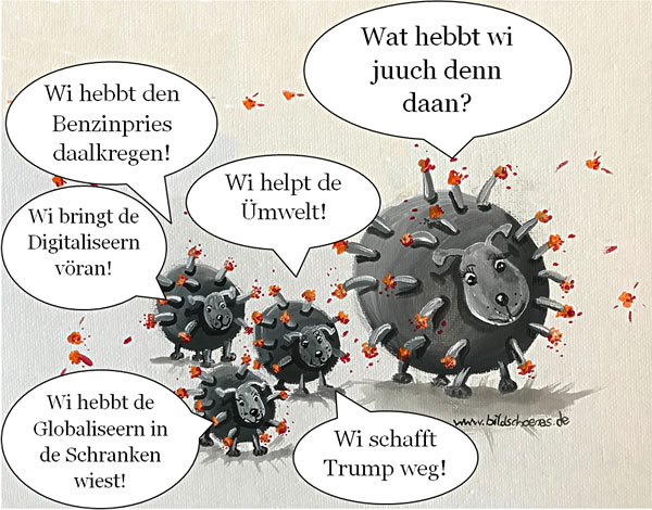 Aschermiddeweek fangt de Fastenakschonen vun de groten Karken an; de vun de evangeelsche Kark heet "7 Wochen ohne", d.h. een schall söben Weken op wat verzichten, elk Johr wählt se wat anners. Düt Johr hebbt se dat Motto wählt "7 Wochen ohne Panik". Düsse Ingeven mutt wirklich vun Gott kamen merrn in Donald Trump sien permanenten Toovsuchtsanfall, den se "Präsidentschap" nöömt. Ik heff mi glieks inklinkt, ik warr versöken, düsse Fastentied un wenn mööglich noch länger ahn Panik to överstahn. Wat dat de armen Ukrainers ok lücken warrt? Wat wi nu tominnst weet, is: In de neegsten Johr kriggt de Rüstungsindustrie (sünd se nich everybody's darling?) hunnerte un överhunnerte Milliarden in'n Mors schaven. Borgte Milliarden. Un de Tinsen för düsse Milliarden kriggt de Finanzindustrie (uns leevste Knuddelchens!), un dat, wat de Finanzindustrie vun de Tinsen överlett, wannert in de Taschen vun Anleggers vun schöne Investmentfonds (de söten Schnuckelchens!). Düsse sympathischen Weerschapstwiege warrt sik also dick und rund freten, un dor nimmt dat ok nich wunner, wenn de Rieken dorbi noch rieker warrt as sik dat doch höört, nich? Dat is doch soschale Gerechtigkeit. Dank an de Herren Pump un Trutin! Noch en Vördeel: Vun't Klima un vun't Aartenstarven un all dat Gedöns warrt lange Tied nüms mehr snacken düsse dösige Nervkraam blifft uns erspoort, bet uns de eersten Ökosysteme ünnern Moors wegbreekt. Denn is ja fröh noog, sik dormit to befaten, nich? De Natuur schall gefälligst kuschen. Wi köönt ehr ja sünst mit een vun uns niege Panzer bedrauhn. Denn süht se, 'keen de Starkere is! Düsse Fastentied, dücht mi, warrt lang duern. Man bloots keen Panik! |