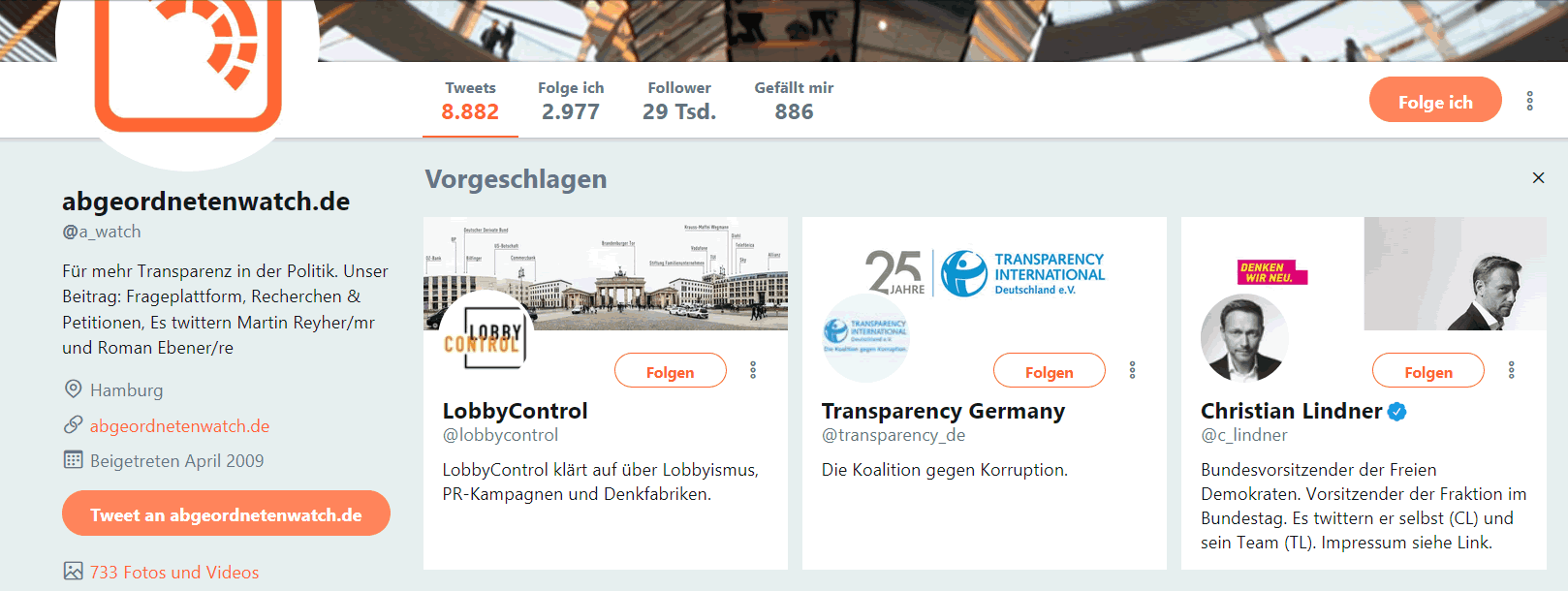 Algorithmen also mathematische Aflööp bestimmt ja angeevlich so veel in't Web. Avers mennigmaal maakt se mi spraaklos. Düt Bild kreeg ik hüüt to sehn: Ik harr jüst tostimmt, de Organisaschoon "Abgeordnetenwatch" op Twittter to folgen. Normaal kriggst denn ja ähnliche Vörslääg nalevert; ik krigg "LobbyControl" vörslaan un "Transparency Germany" un äh? Christian Lindner. Also twee Ähnliche un een Gegendeel. Lindner is ja nu wirklich dat Gegendeel vun Transparenz, Korruptionsbekämpfen un Lobby-Kuntrull! Ik heff bloots twee Erklären dorför:
