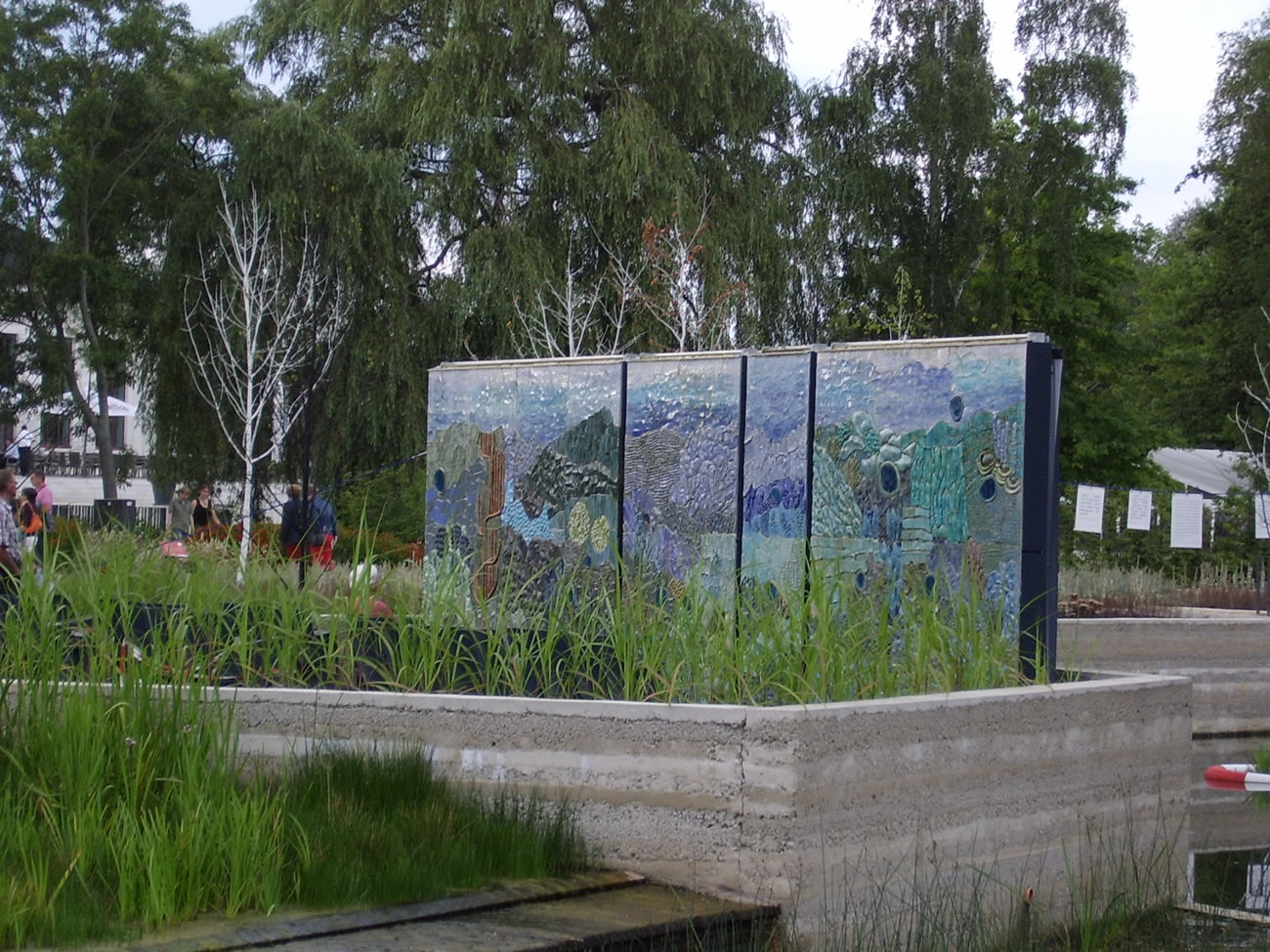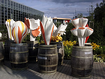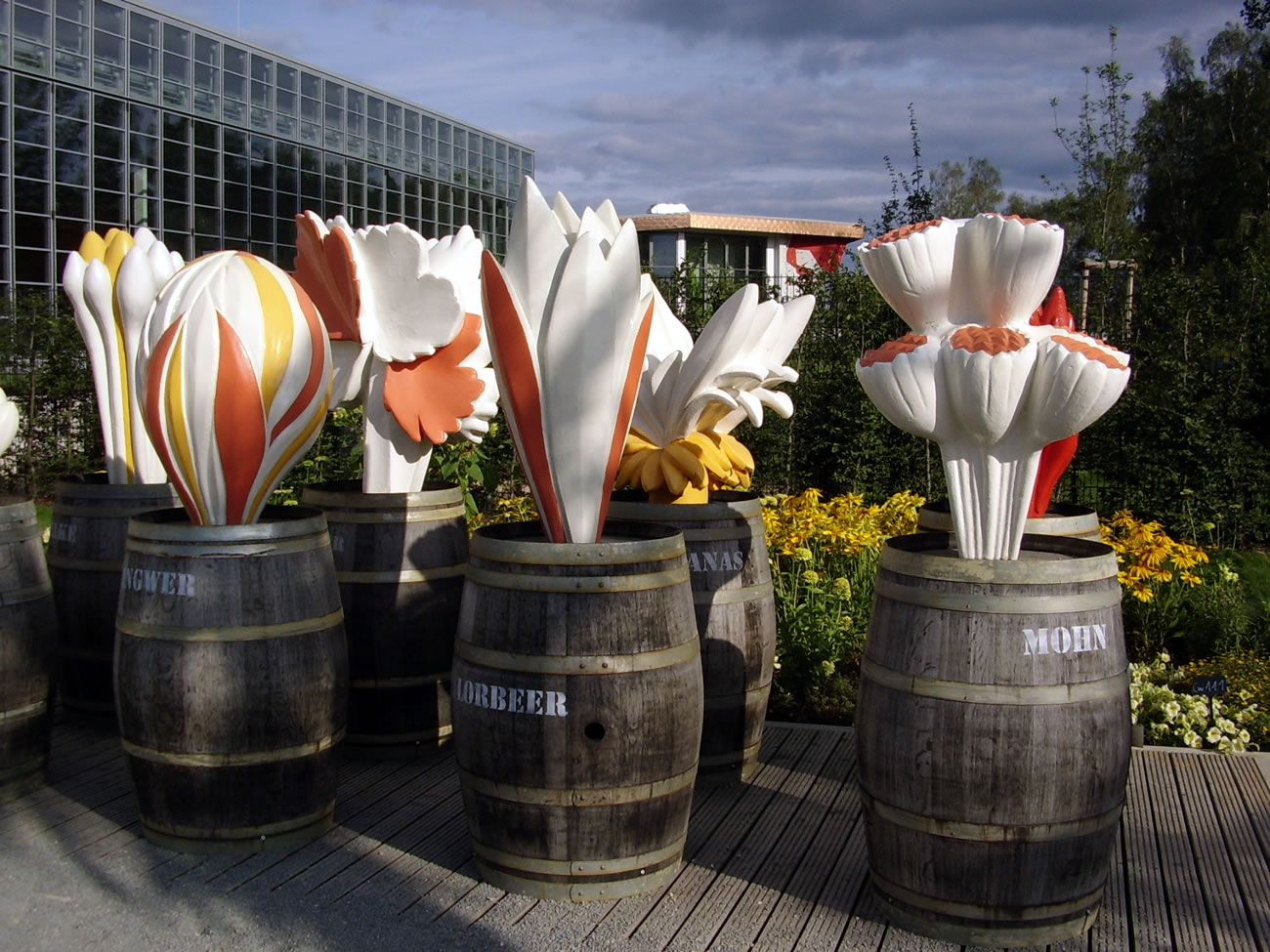 In de Blomenhalln wüllt wi nich ringahn, wi wüllt dat Daglicht geneten, so lang dat geiht mit uns' Avend-Ticket. So laat wi uns op den Hööfdweg vun de "Haven-Welten" mitnehmen. Düsse Deel vun de Utstelln lett avers nich so recht as en Goornschau; ik föhl mi ehrder an de Expo 2000 erinnert. Düt is en Aart Planten-Lehrpadd, een kriggt t.B. veel över Boomwull, Bambus, Siedenrupen vertellt. Bi de Siedenruup is de Betoog to de Plant natüürlich de Muulbeerboom, den sien Bläder de Siedenrupen freet. Twee dorvun (Muulbeerbööm, nich Siedenrupen) thront op den Container, de de Infos to de Sied wiest.