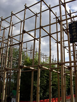 De Bambuswelt gefallt uns good, de Lichtheit un Stabilität vun düt Materiaal is basig. In Asien buut se dormit Holtgerüsten för Hoochhüüs. De Bambuswelt hier is jüst so en Gerüst, mang dat lebennig Bambus wassen deit dat lett, as blöhn de doden Stämm.