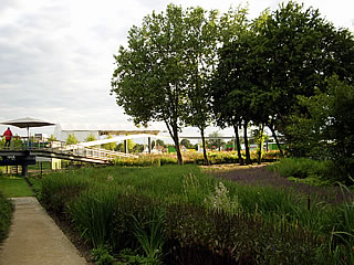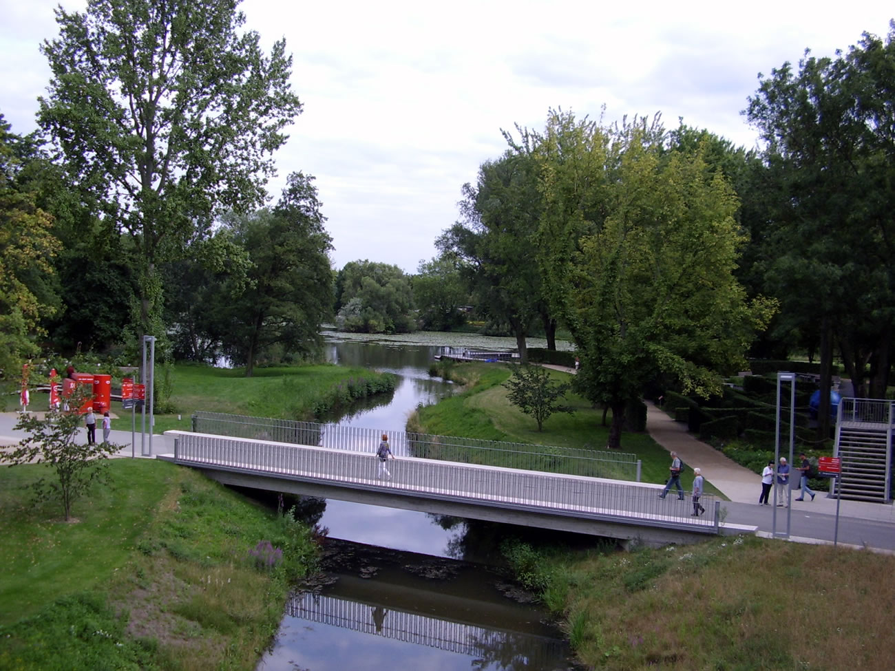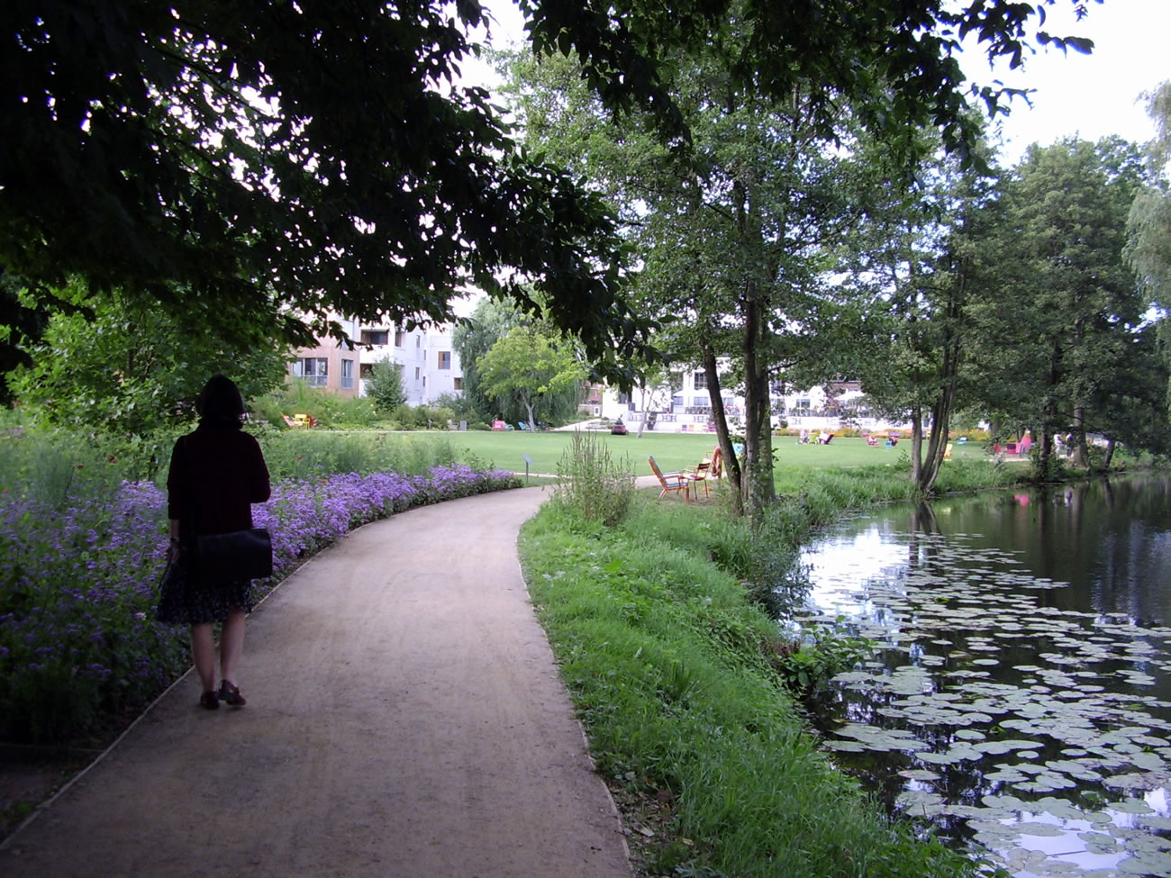 De Brüggenkonstrukschoon lannt in en anmodig Blomenfeld in Rood un Lila. De Rasen is allerdings nich wussen, sünnern Rullrasen, as op't Footballfeld. Hier fangt de Waterwelten an. Twee ansehnliche Seen sünd hier inslaten, de Mahlbusen (heet wirklich so) un de Kükenbrack. Wi besluut, wi wüllt nich üm all rümgahn, sünnern mehr so mangdör op en Weg, de över en smucke Brügg föhrt. Dor sünd wi nu en beten benaut, denn dat lett hier so as in mennigeen hamborger Park: Seeöver mit Bööm. Ganz nett, man annerwegens nehmt se dorför keen Intritt. "Oh! Ji Döösbartel! Ji harrn den Nevelwoold söken müsst! De is wunnerbor. De Nevelwoold is heel versteken!", seggt mi later Kolleeg Andreas, de en Duerkoort hett un hier allens kennt. Tja, den Nevelwoold hebbt wi nich funnen. Na de Welt vun de Religionen gaht wi nich rop, wi böögt achter den See "Kükenbrack" rechterhand af. Hier geiht dat na de "Niegen Hamborger Terrassen", un wedder süümt niege Hüüs den Weg. De Lü, de hier wahnt, hebbt dat wohraftig nich slecht drapen!! Man se mööt dat ok betahlen könen. Ümsüss kann dat nich ween.