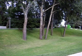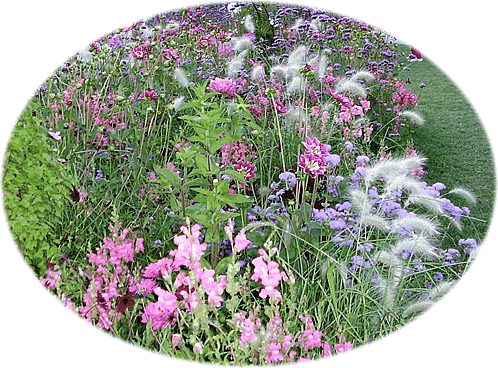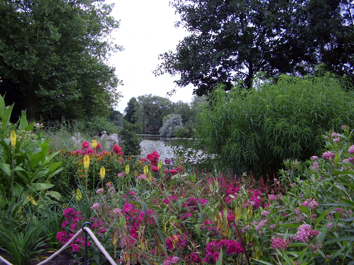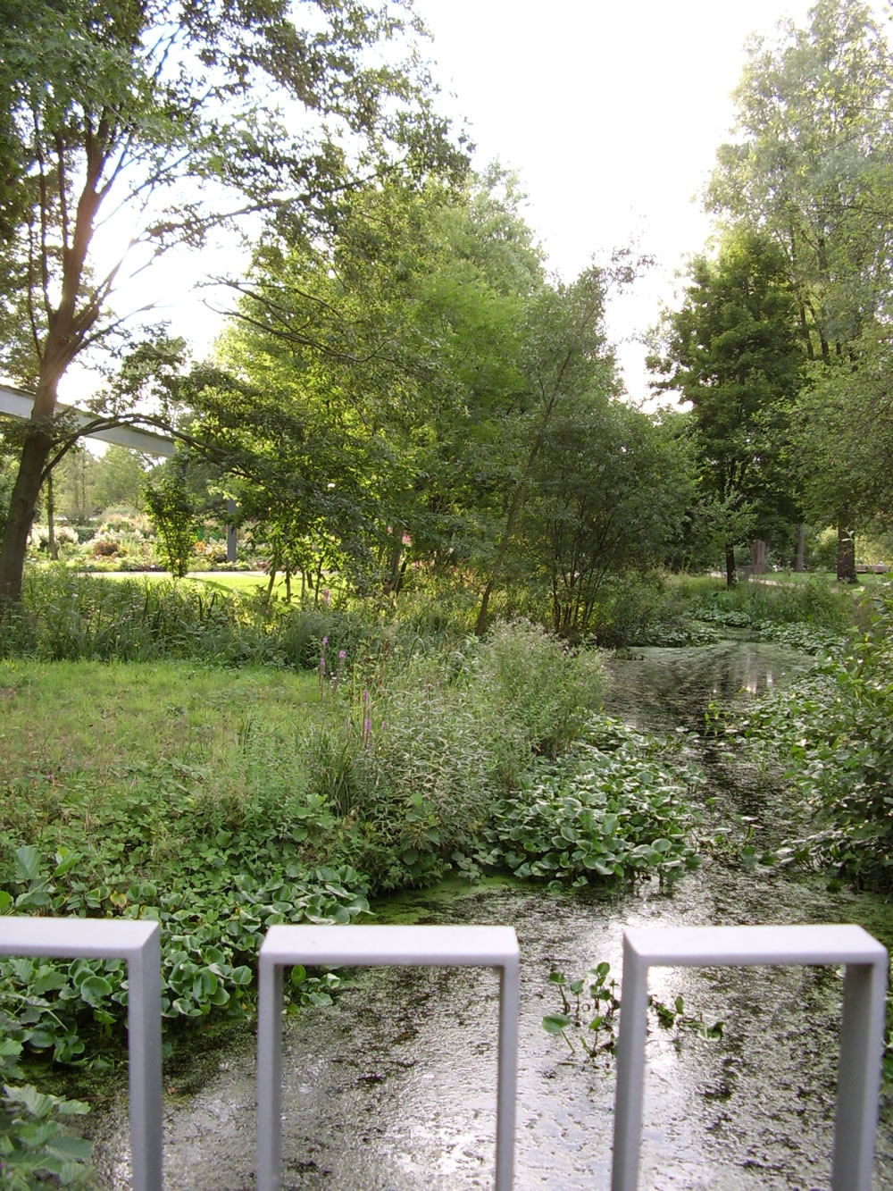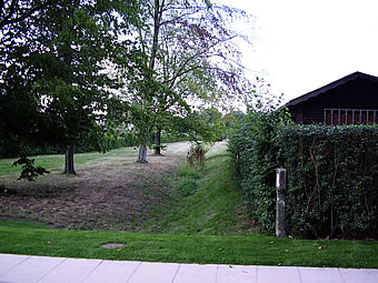 uns to wiet af. Sachs is dat avers bloots physisch meent. Aftoogsgravens orr Wettern loopt hier pielgraad de Ass na den Hööfdingang hooch. Wi sünd op en heel sied Moorflach, dor erinnert se uns an. Man se sünd schöön beplant un passt in de Komposischoon. Rosengoorns sünd hier, de Blöden sünd al raar woorn. To de Rosentied mutt dat hier kaptaal utsehn un duft hebben dorför kaamt wi to laat in't Johr.