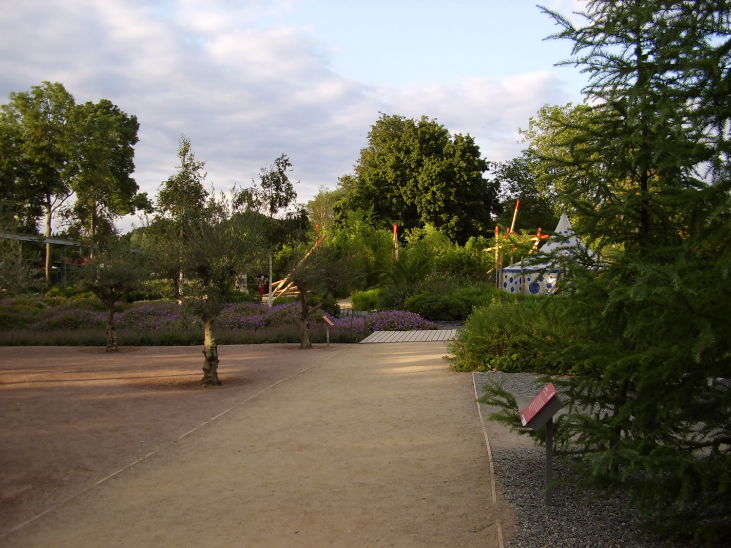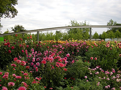 Dorachter geiht dat wieder na de "Welt vun de Kontinente". De "Aafrika-Goorn" grööt mit rode Robinienstämm, de en Kraal andüden schallt. Ümrüm sünd Bananenstauden plant, de apensichtlich vun ünnerscheedlich Soorten stammt. Kochbananen? Eetbananen? Hier as annerwegens ok harrn wi uns mehr Infos wünscht. De "Welt vun de Kontinente" hett faken wat Vördergründigs, Banales för uns. Wööst: Sand. Aafrika: Kraal. Pyramide: Ruine. Un so wieder. Dat dücht uns, as wöör mit Klischees arbeidt. Sachs is dat avers ok nich licht, op engen Ruum enkelte Akzenten to setten, de depere Insichten vermiddelt. Dat Bild baven wiest düsse Överflächlichkeit bispeelhaft. Dat Bild wiest veer Goorns opmaal: achtern den Oostasien-Goorn mit en överdimensionales chineesches Stäbchen-Orakel (kannst wirklich Orakel mit trecken), rechterhand in'n Achtergrund en araavschen Goorn mit Telt mit Kissen binn un Sand ümrüm (ja wirklich staats de wunnerboorn Watergoorns, de wi in't maurische Spanien findt), rechterhand vörn en "Alpengoorn" mit Nadelbööm un en "Via Mala", de vun Steen süümt is (de Steen erinnern uns an de Oosterinsel), linkerhand vörn den "Olivengoorn", de eenfach en leevlos anplante Olivenhain is. Fernanda, de ut Spanien stammt, seggt, de Bööm warrt dat sachs nich överleven, de Wötteln seht al slecht ut. Linkerhand, nich op't Foto, stunn noch en grote Infowand to Olivenööl mit Rezepte! Reinweg afsurd warrt dat in den "Noordamerikaanschen Goorn", de glieks to Ingang vun de "Kontinentwelten" liggt. Dat is gor keen Goorn, sünnern en politische Polemik. Op'n Borrn sünd sellschapliche Slagwöör "plant", so as "Democracy" un "Upward Mobility", un symboolsche (Un-)Kulturelemente, so as de Ketchupbuddel. Hier also kriegt wi kulturelle Klischees nochmal mit'n Holthamer verpasst. För US-amerikaansche Besökers stell ik mi dat reinweg kränkend vör. Weer dat wirklich nödig? Op en Goornschau??? Veel beter hebbt dat de Schrebergoorners, de nu rechterhand liggt, denn de Graven blangen ehr Kolonie is wunnerschöön mit Rohr un Gräser anplant. Wi böögt nocheens af na den "Verlaren Goorn", de en Speelplatz ween schall un wirklich orrig verlaren wirkt. He hett dormit wat Authentisches, solk Ecken kennt wi in Wilhelmsborg. Dorachter treckt sik en smalle Striepen "Naturwelten", man de entgeiht uns so'n beten, denn uns treckt dat na de grote Böhn an'n Ingang to de "Lebennigen Kulturlandschapen". Vun dor kümmt Musik un Lachen. Man ehrdat wi bi de Böhn ankaamt, geiht dat dör dat schöne Duppelhalvrund vun den Dahliengoorn. Is Dahlienblööt! Dat lett wirklich wunnerbaar. Dat gifft ok apen Dahliensoorten, 'neem de Insekten wirklich mal an den Pollen rankaamt. Schöne mehrklöörige Soorten sünd dorbi. Wi bewunnert de Pracht.