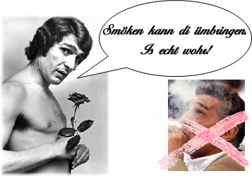 Aver vun wat kann he denn leven? Du maakst di Gedanken üm de falschen Lüüd! Dat de Mehrwert- un Versekernstüer op negenteihn Perzent ropgeiht, argert di nich? Dor warrt sünnerlich lütte Lüüd afkassert! Ne! Bertha is gegenan gahn. Ik heff leest, dat Eten, also Levensmiddel, nich düerer warrt. Blot Nonfood. Un dat köönt sik de Armen al so nich köpen. Woto bruken se denn ene Versekern? Mit Bertha över Politik oder Wirtschaft to strieden hett al so keen Sinn! Nonfood hett se opsnappt ut de Bildzeitung un denkt as de annern Leser, dat mutt wat Kostbares sien! Aver dien Rudi Assauer kann sik bald sien Luxusauto un de düren Zigarren ok nich mehr verlöven. Villicht kriggt he nu en Anbott vun'n Gesundheitsministerium. De planen ene Smöker-Opklaren in Tietschriften un Anslagsülen. Ik kann mi dat goot vörstellen: En Exklusivfoto vun Rudi in'e Mitt vun'n Text ahn Zigarr, aver mit apenen Mund. Un as Spreekblaas Rauchen kann tödlich sein!