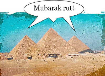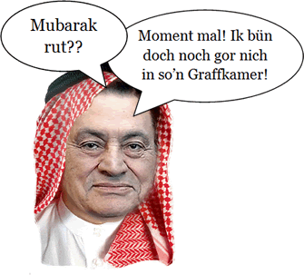 De flüggt den nor Kairo un vertellt Mubarak so lang Märken ut 1001 Schlichtungsrunde, bit se beed tohop freedlich inslopen sünd. Un denn kunn dat Volk se heel sutje ut eern Palast rut dragen un in irgendeen Oase ünner en Dattelpalme setten. Un wenn se nich sturben sünd, denn holt se sick nor hüüt för unverzichtbor. Jüs so as Maat Jan 5.2.2011