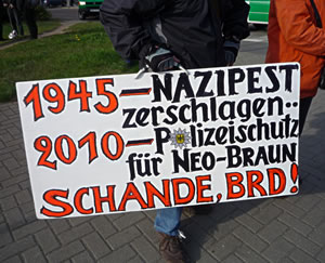 Ick sülven bün annerletzt eerst vun de Staatsgewalt dwungen worrn, mit mien Auto antohollen. Un denn schull ick jüm ok noch miene persöönlichen Papiere wiesen. Wo blifft dor de Datenschuul? Dor hebb ick mi dacht: Nee, nu leist du mol Weederstand! Ick hebb mi vör den Bullizisten henstellt un seggt: "Geevt Se mi foorts mien Föhrerschien trüch, Se... (pass op, nu kümmt dat:) ...Se linksgröönversiffte Nazi-Faschist!"