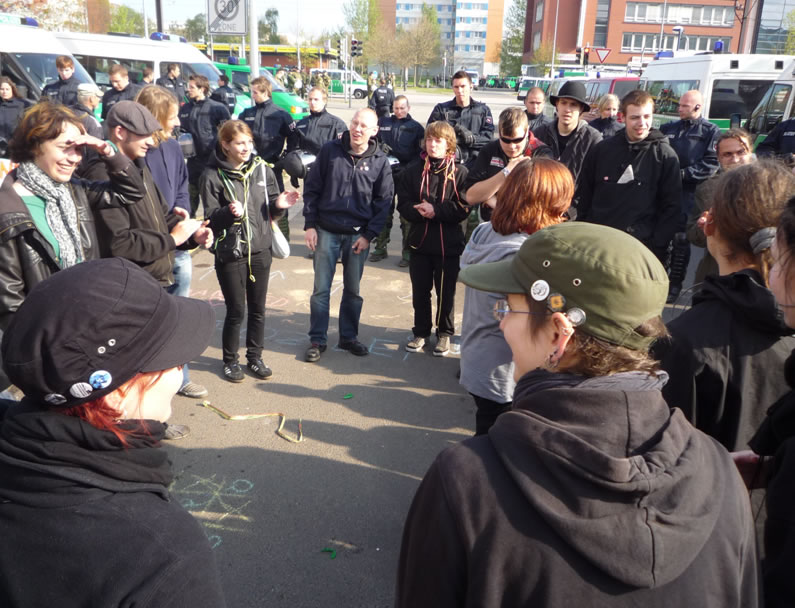 Dei Nazis harrn ehrn Plan wägen disse oewertüüchten Linken woll ännern möten orrer von Anfang einen annern Wech nähmen wullt, üm nich tau verliern, denn gegen 13.30 Uhr wüür bekannt, datt sei von 10 Polizeiautos vörwech ganz anners as plaant oewer dei Oll Warnemünder Chaussee in Richt Groß Klein trecken dähn!