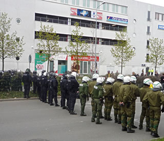 Upp keinen Fall wier dat so, datt is mien Meinung; ook dei wenigen ölleren Lütten Kleiner hinner denn Polizeikordon beööchten datt Geschehen taustimmend, doch sei reihten sick nich in denn Blockadblock in. Man kann ehr dat nich verdenken, denn dei oewer dusend Polizisten schreckten aww, un wer wüll sick in sien Öller noch mit dei Polizei anleggen. Doch wenn Dusende von Börgers kaamen wiern, harr sick dei Polizei bestimmt trüchhollen un harrn dei Demonstranten nich ümzingeln un inschüchtern koenen. Dei Kandidat vonne Linken, Helmut