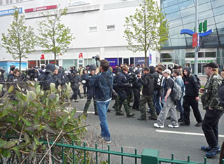 So gegen Klock 15.00 hemm dei Nazis upgäben, un mi gegenoewer düüdeten Jugendliche mit ehren Duumen na baben! Sei harrn siegt, denn dei Nazis wiern nich na Lütten Klein rinkaamen un harrn sick up dei Rückfohrt maakt. Gegen Klock fief künnen ook dei Polizeibereitschaften uut Schleswig-Holstein, Neddersassen un Mäkelborg-Vörpommern werrer ehr Rückfohrt anträden.