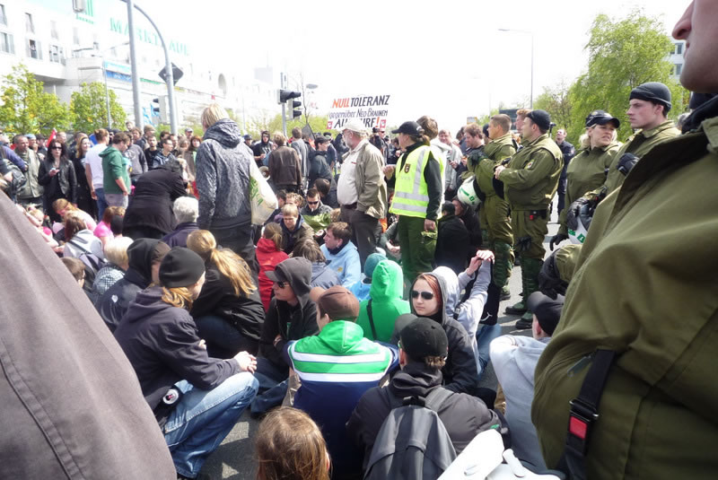 dat sick dei Jugendlichen nich provozieren laten süllen. Dei Instellung von dei Polizisten as so nöömte "Antifaschisten" wüür werrer düütlich in dei Stunn'von dei Blockad': Antifaschisten-Polizisten hinnerten dei Jugendlichen dörch ehr Blockadtaktik, dat sei ehre Meinung gegen denn Uppmarsch von dei Neo-Nazis taun Uutdruck bringen künnen. Ook Lietz hett einen dullen Patzer von sick gääben. Hei erinnerte an dei Gewaltlosigkeit vör 20 Johren, denn ook dormals wieren sei in Rostock gegen Panzer siegreich blääben. Luude Pfiffe folgten up dissen unwohren Vergliek. Wenn hei dormit denn Maut anerkennen wüll, harr hei sick bädere Wüürer infallen laten süllt. Heiko Lietz wier spärer nich miehr tau seihn, hei wier woll in't Fischerdörp gahn. Dei ehemalige Gesundheitsministerin, Dr. Marianne Linke (sei heit nich blots so, sei is ok vun de Linke Partei) oewer seih ick ümmer noch bi dei Jungen.
