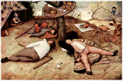 Dat bequeme Leben weer se hillig, sinnvulle Arbeit weer en Schann. De ersten Geschichten vun en Schlaraffenland sünd an dat End vun dat 16. Johrhunnert daalschreben worrn. Liggt nääg, dat de Schrieberslüüd de feudalen Fürsten und den gierigen Klerus mit de Geschichten en Spegel vör de Nääs hool'n wulln, de to de Tied op annerlüüds Kosten en goden Dag leven. Nu dat sünd de Geschichten vun güstern, de Welt hett sik dreiht un is doch stohn bleven. De Wunsch un de Droom, in Riekdom to swögen, lett sik nich doodsloog'n. Dat Streben na Geld un Macht ward ok vundaag noch vergöttert. Noch ümmer gläubt vele Menschen: Wenn dat vele Gold in de Karken den leven Gott ehrt un freut, denn kann dat ok för den Menschen nich sündhaft ween, na överdreben Prunk, Ruhm un Ansehn to streben.