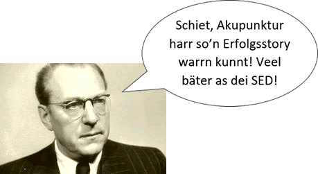 den dei hütig SPD för ehr Geburtsstunn' höllt. Man verhålt sik, weit wer ümmer nich so ganz genau, wat un wohen man as Midde-links-Partei mit Marx sien Gedankengaut stüern will, un denn kümmt dei Rosenmånd (Juni) 1933 un dei NS-Regierung ünnersecht dei SPD jedwed politisch Akschonen un brandmarkt sei as "staatsfiendlich". (Ja, uns' SPD, dei hüüt in Düütschland as dei staatsdragen Partei överhaupt gellt un dei jüst wedder sik sülven gägen ehrn Willen un sogor gägen ehr Intress in dei Plicht nahmen hett, mit Merz en Regeern tau billen, bloots dat sei den Staat vör dei AfD reddt. Na good, in den Sinn gägen Nazis sünd se wirklich fiendlich.) Nå'n Maimånd 1945 kümmt Discher Willem Pieck (Kommunist, 1876-1960) för'n Nieanfang ut't Exil in Paris un Moskau inne sowjetisch Besatzungszoon taurüch un deit sik dor mit Baukdrucker un Koopmann Otto Grotewohl (Sozialist, 1894-1964) tausåmen, dei mihrmåls vonne Nazis achter Trallen bröcht wür. Pieck sorcht för'n Nieanfang vonne KPD, Grotewohl för'n Nieanfang vonne SPD un up Drängen von Stalin, so ward vertellt, beschluten beid, sik tau verbünnen, un grünnen denn an'n 21./22. Prilmånd 1946 dei SED mit dei twei Vörsidder Pieck un Grotewohl anne Spitz. Pieck ward denn mit dei Grünnung vonne DDR dei ierste Präsident un Grotewohl dei ierste Ministerpräsident.