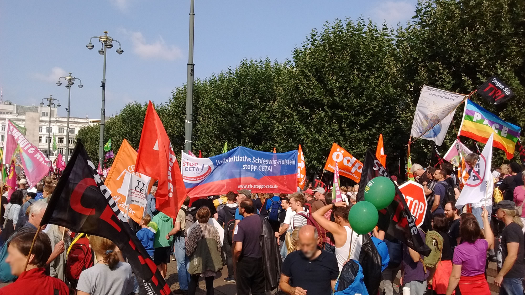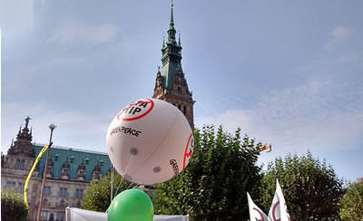 För all, de gistern an'n 17.9. nich hebbt dorbi ween kunnt, hier en lütt Bericht vun de grote Demo gegen TTIP un CETA in Hamborg. Fiefunsösstigdusend schallt dat west hebben dat sehg aver na mehr ut, de Raadhusmarkt weer rappelvull. De Demo füng offiziell Klock 12 an, dor weer de Sünn al rutkamen ik heff mi en lütten Sünnenbrand haalt , man de hele Tied kemen Lü dorto, un ok as ik na Klock twee vun den wannern Toog weggahn bün, kemen mi noch Lü ut de Bahnstaschoonen tomööt mit Plakate ünnerwegens na de Demo. Dor sünd sachs welk Sünnertöög to laat west orr so.