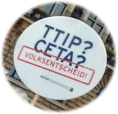 Mit de twee "Hannelsafkamen", sünnerlich mit CETA, warrt dat nu hoge Tied, dor noch en P dorvör to setten. De Argumenten mööt wi hier nich wedderhaaln, al vör Johren hefft wi gode Quelln dorto hier bi Plattpartu verlinkt. Dat geiht üm nich weniger as uns Demokratie gegen de Övernahm dör de Weerschap to verdeffendeern. Ganz sülvstlos wüllt de Grootkonzerne uns ok noch de letzten frien Entscheiden afnehmen! Mennig vun de Argumenten staht hier un welk staht ok op de Plakaten op. Snaaksch is, dat vundaag masse Lü uns ach so sülvstbestimmte Levenswies gegen "Frömde", Migranten, Flüchtlinge verdeffendeern wüllt, de angeevlich bloots Kosten bringt un keen Stüern tahlt; dat avers de Profitgier vun internaschonale Konzerne, de narms Stüern tahlt, en veel grötter Bedrauhn ween kann, is ehr nich bewusst. Man de Industrielobbies laat ja nich locker, as'n Hund, de sien Büüt nich ut de Fäng geven will. Dat neegst Afkamen, dat se versöökt, warrt TISA ween; dor geiht dat üm Deenstleisten. Weer dat nich schöön, wenn endlich ok uns öffentliche Waterversorgen privatiseert wöör un Nestlé orr RWE uns slechter Water to höger Priesen verköpen dä? Süh, dat kriegt wi mit TISA. Alternative: Hier. Un wählen. Un demonstreern.