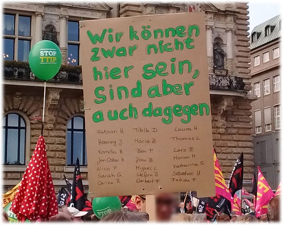 De Reden will ik nich wedderhaaln; bi solk Veranstalten is ja tomehrst al Konsens. De Reden weern good, Fruuns vun de Kark, ut de Landweerschap un vun de Organisaschoonsgrupp hebbt spraken; un de Musik weer 1 a. Tovörderst avers gah ik na so'n Demo, üm Lü to drapen, ehrn Optoog un ehr Plakate to sehn, mit ehr to snacken un ehr Sichtwiesen wiestokriegen. Hier de schöönsten Plakate vun de Demo gegen TTIP un CETA (sünner Gewähr mach ween, dat mi noch schönere dörchflutscht sünd). Sünnerlich gefallt mi ja jümmers de sülven maakten, handmaalten mal mehr, mal minner originell. Besünners toseggt hett mi bi de Optaktveranstalten Klock 12 op'n Raadhusmarkt de liedenschapliche Reed vun de Melkbuursche, de in to Harten gahn Wies un Wöör klorstellt hett, wat för'n Gefohr de Afkamen för de Landweerschap in lütte Familienbedreven is se warrt över de Kling springen, bloots de Agrarindustrie warrt TTIP överleven. Wieldat dat de Nohren en Punkt is, de all direkt bedrepen deit, leeg dor groot Gewicht op, so hebbt ok Buurn mit ehr Treckers den Demo-Toog anföhrt, as he sik so bi Klock een Richt Alster in Bewegen sett hett. Good gefulln hett mi noch de Redner vun Greenpeace, de in sien Iever verspraken hett, "Zitip un Teta" to Fall to bringen (sünd dat noch twee Afkamen? Ik dach, wi harrn mit Titip un Zeta noog...)